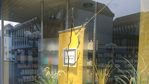 Als Dr. Stephan Rinn am Dienstagmorgen seine Königsau-Apotheke aufmachen wollte, sah er die Bescherung. „Wir liegen in einer Seitenstraße, darum hat wohl vorher niemand etwas bemerkt.“ Das Loch sei mit 30x50 Zentimeter Durchmesser zwar relativ klein. „Aber die Scheibe ist über fünf Meter weit gesplittert.“