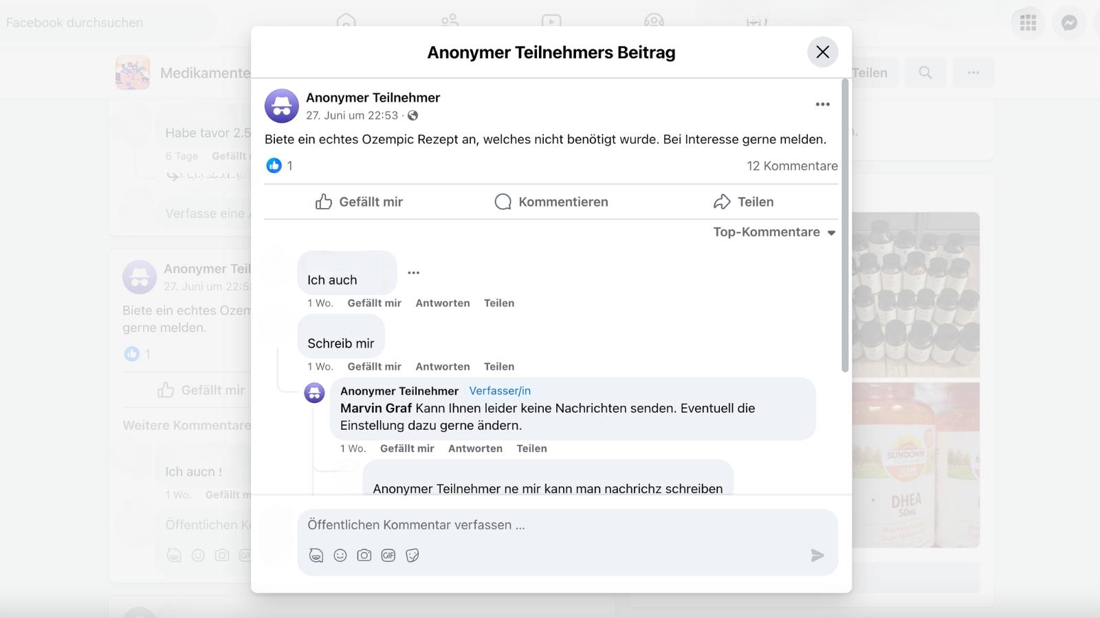 Wem der Kauf von Rx-Ware über Facebook zu heikel ist, der kann auch auf alternative Angebote zurückgreifen: „Biete ein echtes Ozempic-Rezept an“, schreibt ein anonymer User. Die Verordnung werde nicht mehr benötigt, bei Interesse könne man sich gerne melden. Fragen zum Angebot beantwortet der Verkäufer öffentlich nicht; wohl aber zur privaten Kontaktaufnahme, die scheint dem ein oder anderen User Schwierigkeiten zu bereiten.