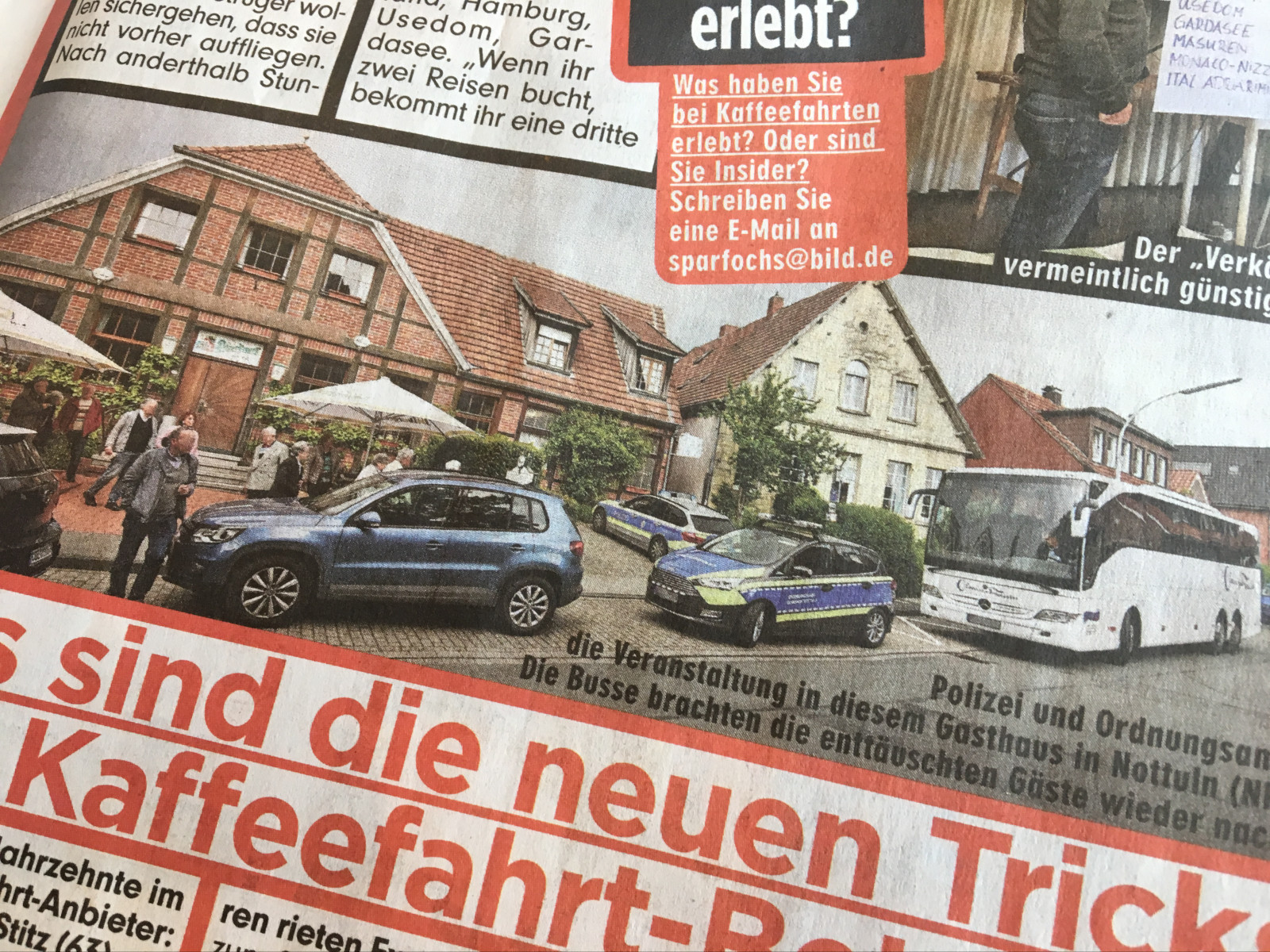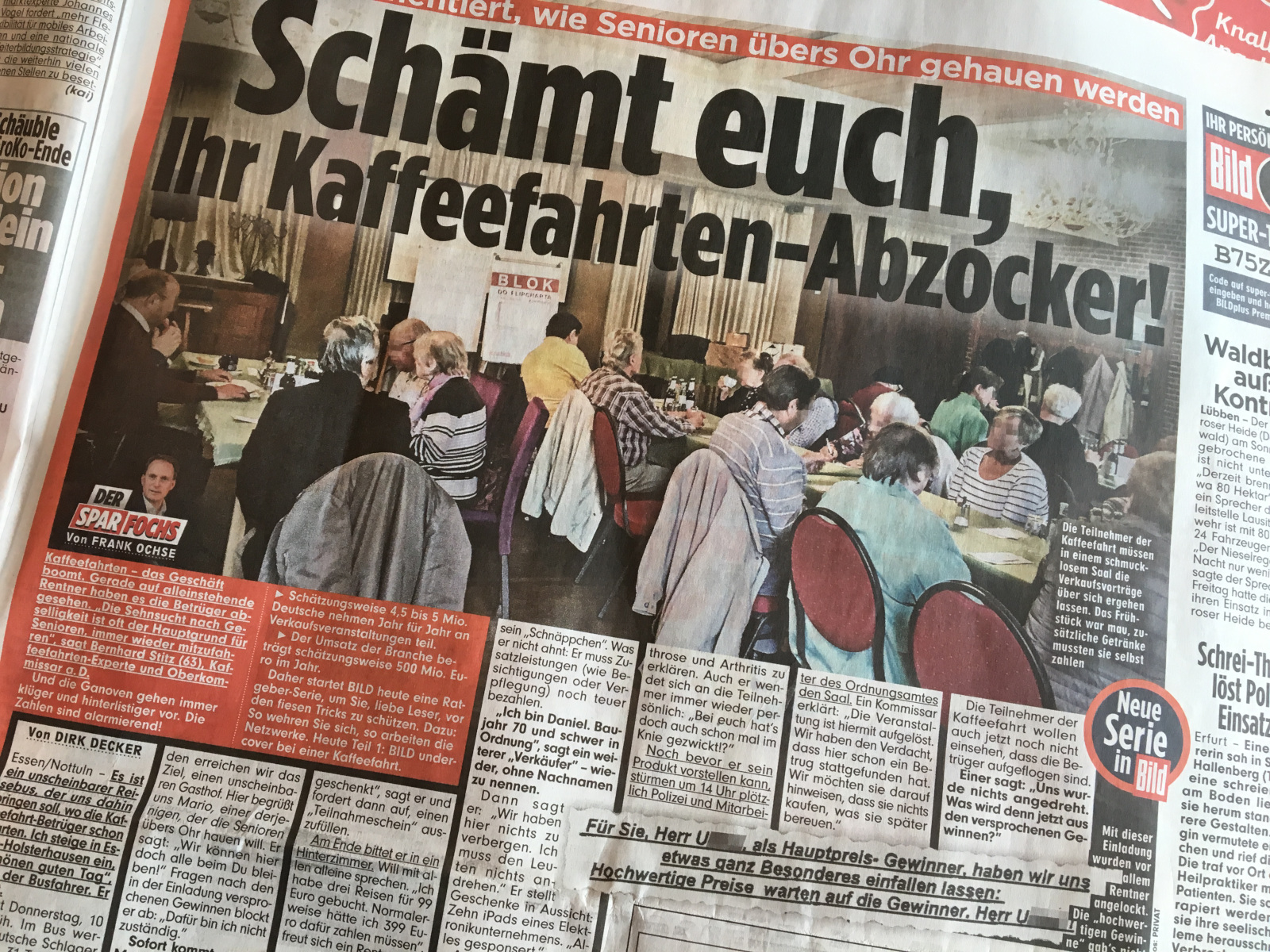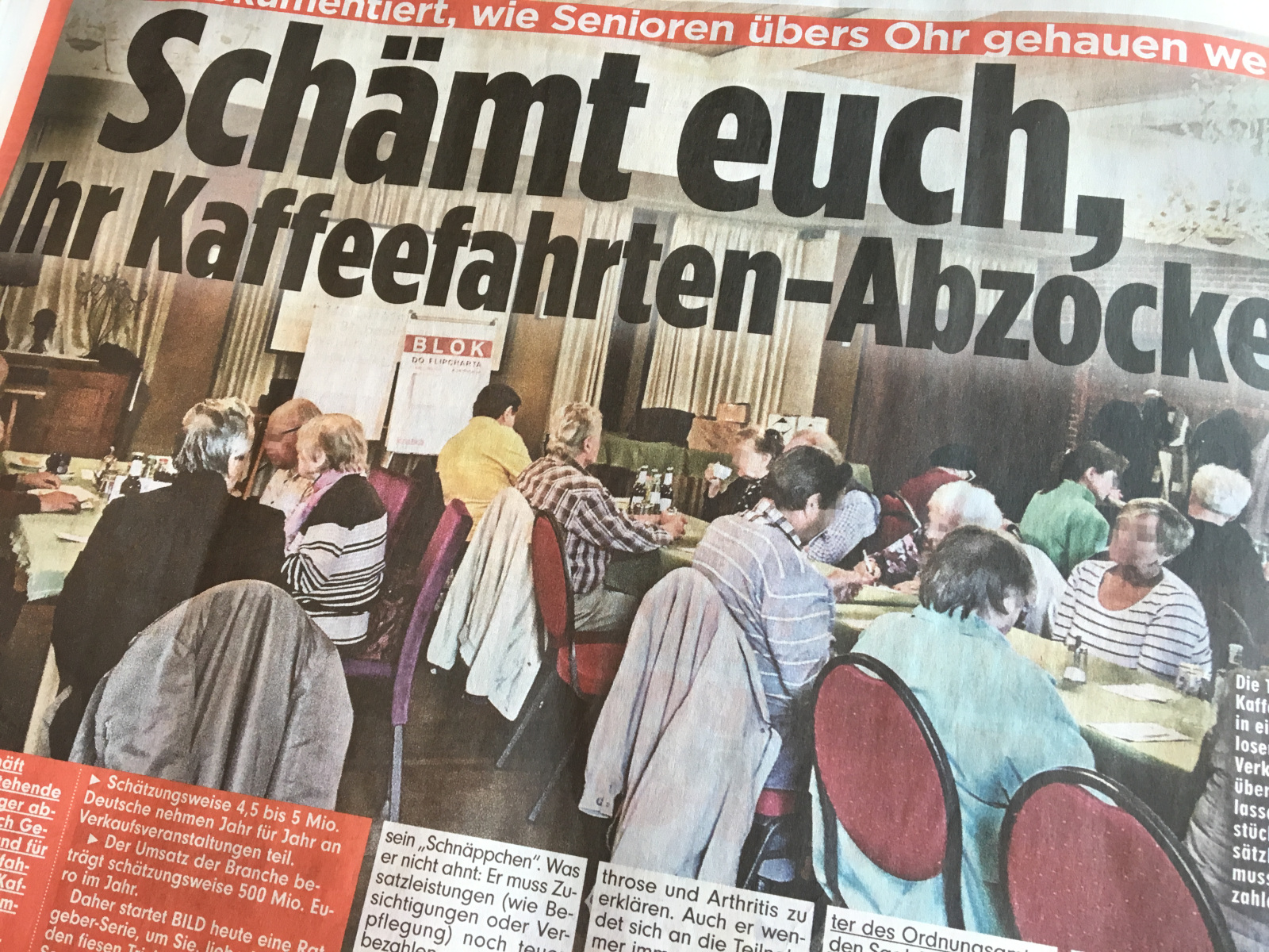 Bild berichtet vom Verkauf von Vitaminpulvern, die zu horrenden Preisen auf einer Kaffeefahrt angeboten wurden. Die Vorgehensweise der Betrüger: Die Teilnehmer sollen in der Apotheke anrufen und den Preis des Präparats abfragen. „Der unvorbereitete Apotheker nennt den völlig überteuerten Listenpreis. Der des Kaffeefahrt-Verkäufers liegt drunter. Trotzdem ist sein Angebot noch überzogen.“