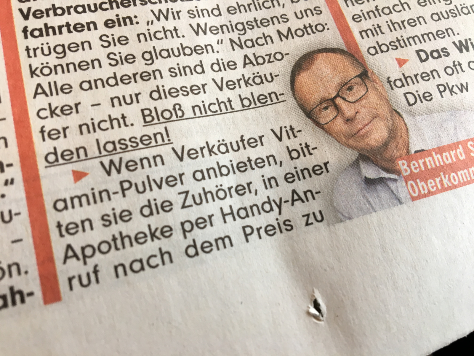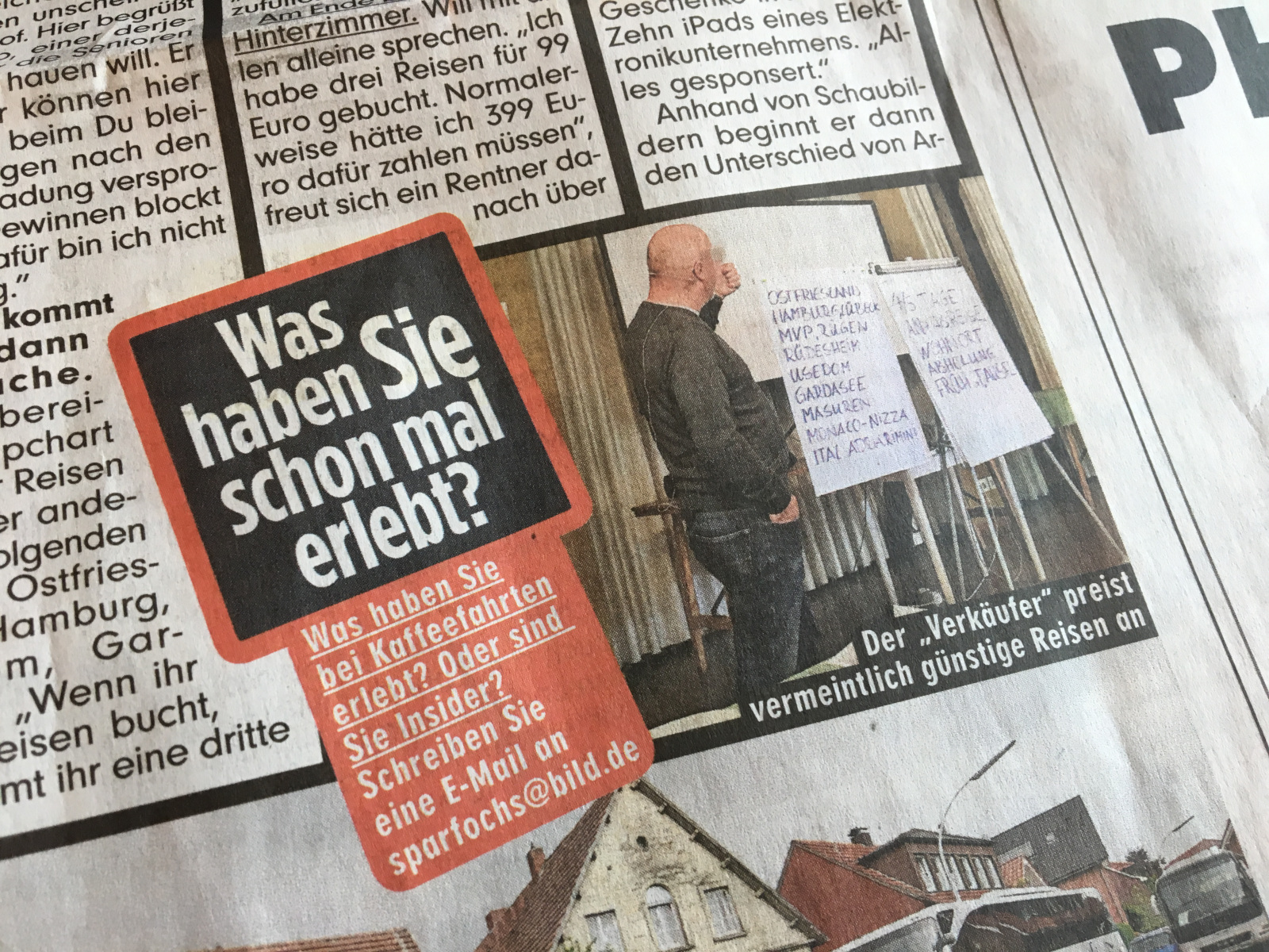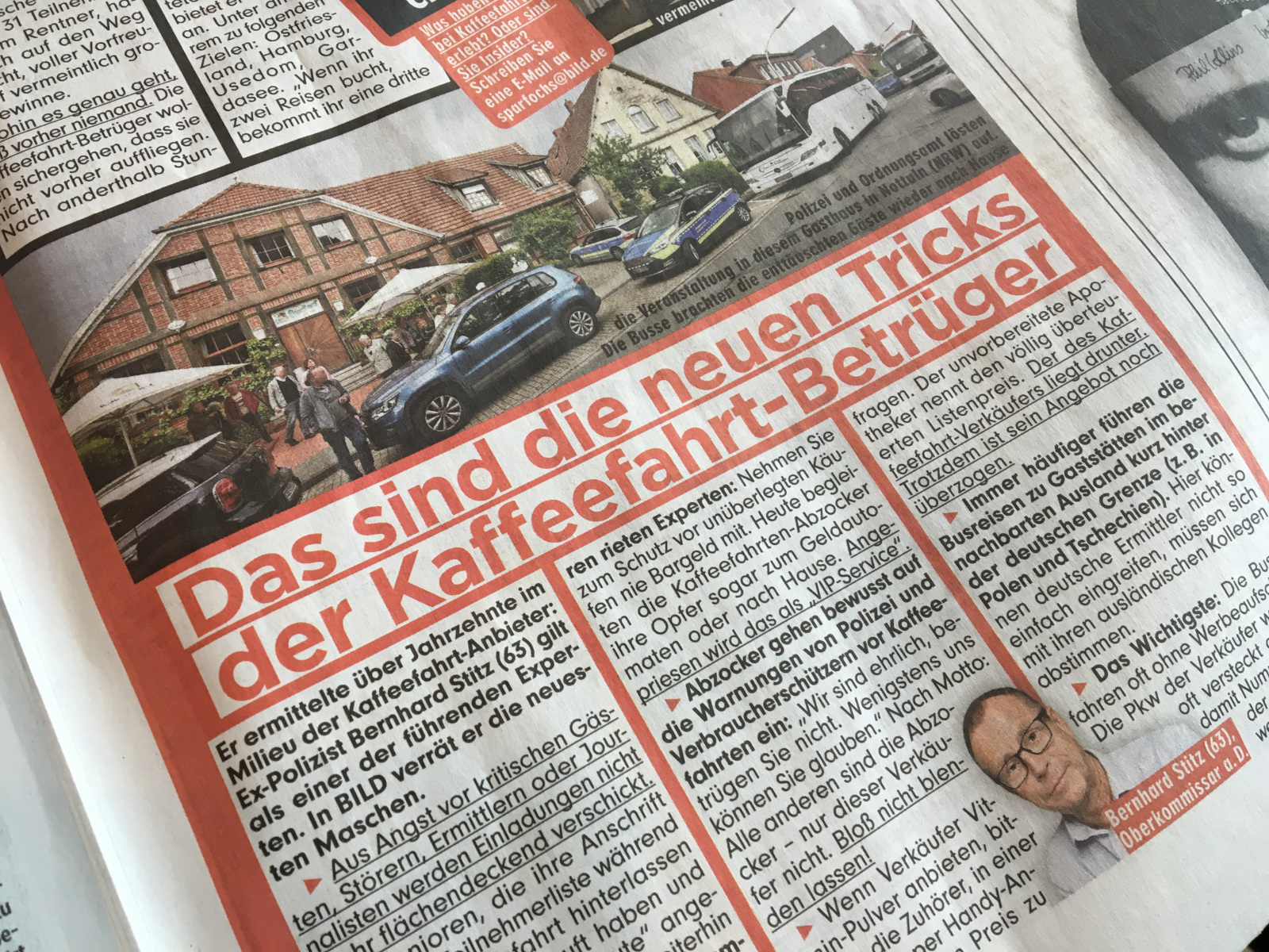Bild berichtet vom Verkauf von Vitaminpulvern, die zu horrenden Preisen auf einer Kaffeefahrt angeboten wurden. Die Vorgehensweise der Betrüger: Die Teilnehmer sollen in der Apotheke anrufen und den Preis des Präparats abfragen. „Der unvorbereitete Apotheker nennt den völlig überteuerten Listenpreis. Der des Kaffeefahrt-Verkäufers liegt drunter. Trotzdem ist sein Angebot noch überzogen.“