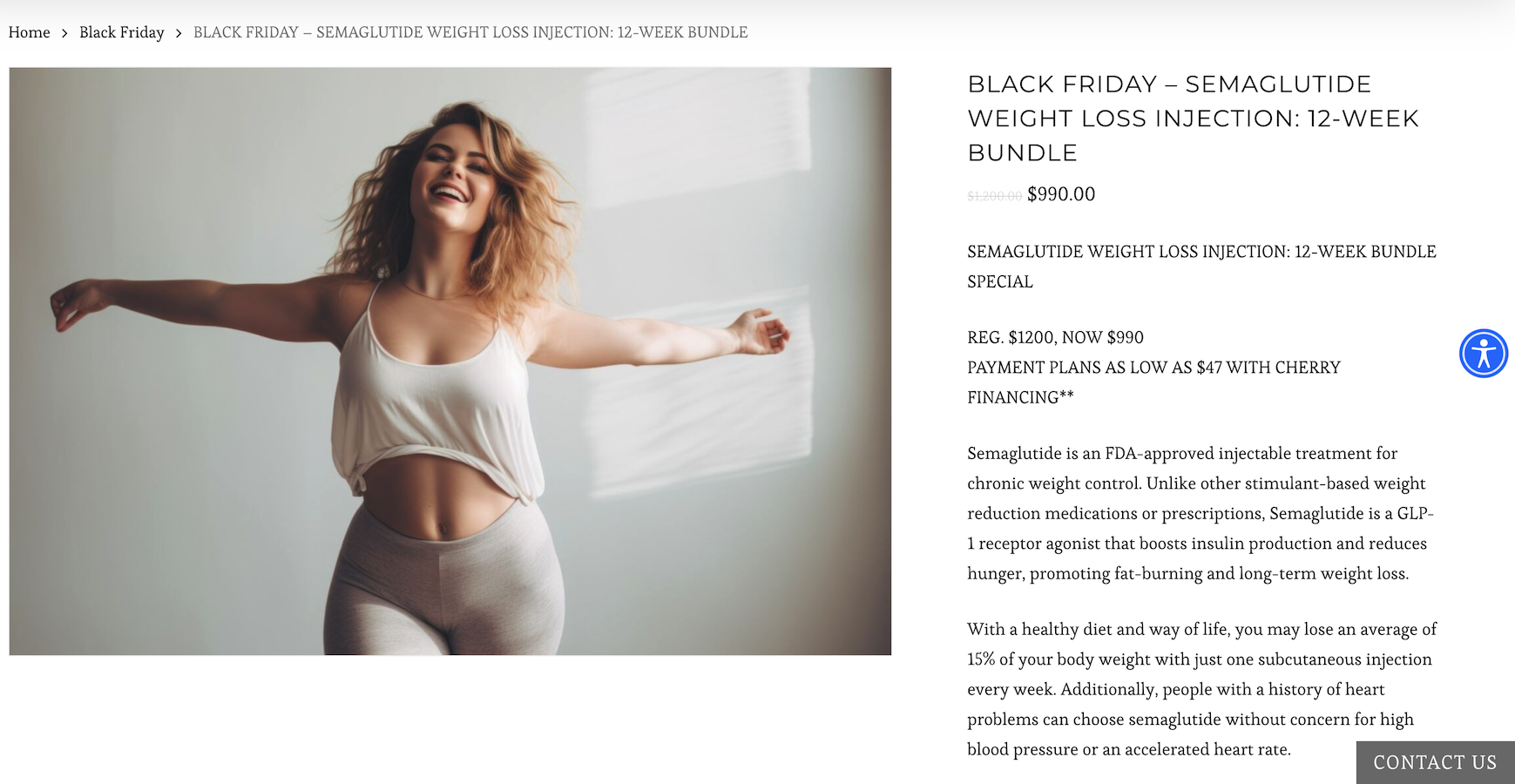 So bietet das „Center For Health And Anti-Aging“ in Florida ein 12-Wochen-Bundle Semaglutid an. Statt 1200 US-Dollar kostet die „Semaglutid Gewichtsverlust-Injektion“ nur noch schlappe 990 US-Dollar. Angepriesen wird die Kur mit einer durchschnittlichen Rate von 15 Prozent Gewichtsverlust des eigenen Körpergewichts – wenn sich die anwendende Person an eine ausgewogene Ernährung und Lebensweise hält. Das Angebot ist auf eine Kur pro Person limitiert und endet um Mitternacht.