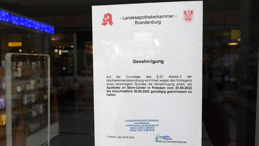 Die Apotheke im Stern-Center in Potsdam von Ina Meiners ist Ende August geschlossen – vorübergehend bis zum 30. September, wie es in einem Aushang an der Eingangstür heißt. Laut einer Angestellten wird die Apotheke aber wohl gar nicht mehr öffnen. Auf einem weiteren Schild werden Kund:innen aufgefordert, sich bei offenen Aufträgen per Mail zu melden oder einen Zettel unter der Tür hindurch zu schieben.