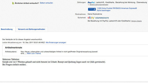 Gekauft wurde das verschreibungspflichtige Medikament im Oktober für 120 Euro. Das Verfalldatum ist mit August 2019 angegeben. Das aktuelle Gebot liegt mit drei Preisvorschlägen derzeit bei nur einem Euro. Wird die Offerte nicht vorab gelöscht, kann noch bis zum 27. Dezember mitgeboten werden. Verschickt wird via Standardversand für 4,99 Euro.