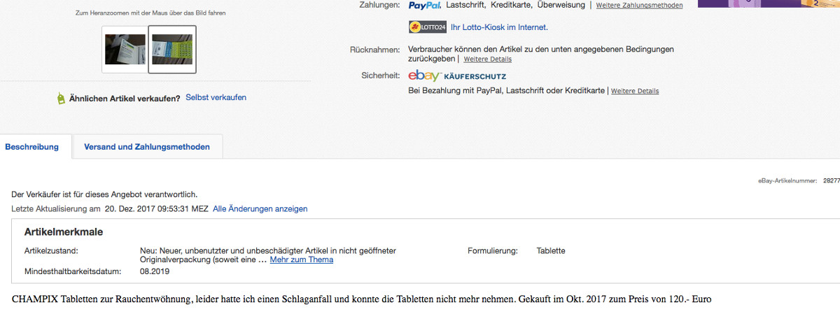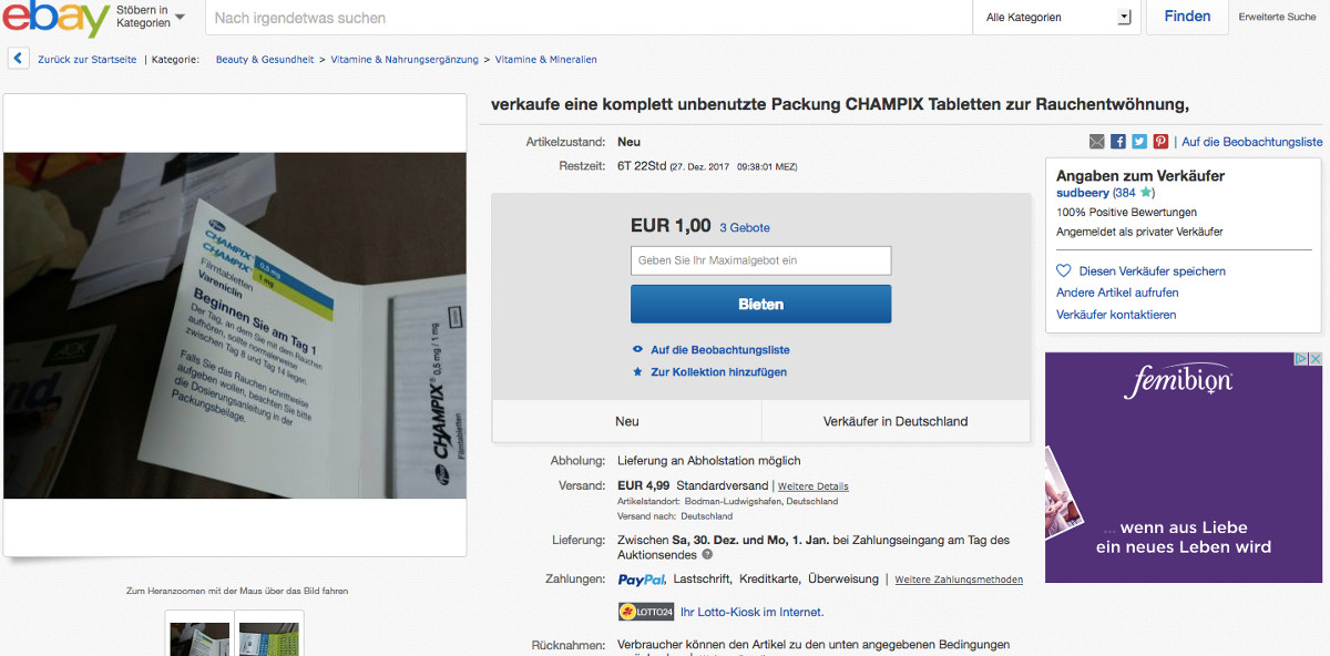 So schlimm das persönliche Schicksal von Sudbeery aus Bodmann-Ludwigshafen auch ist, so verboten ist auch das Angebot im Online-Auktionskaufhaus: Der private Verkäufer hat Champix zur Raucherentwöhnung im Angebot. Die Packung ist noch komplett und unbenutzt. Der Grund: „Leider hatte ich einen Schlaganfall und konnte die Tabletten nicht mehr nehmen.“