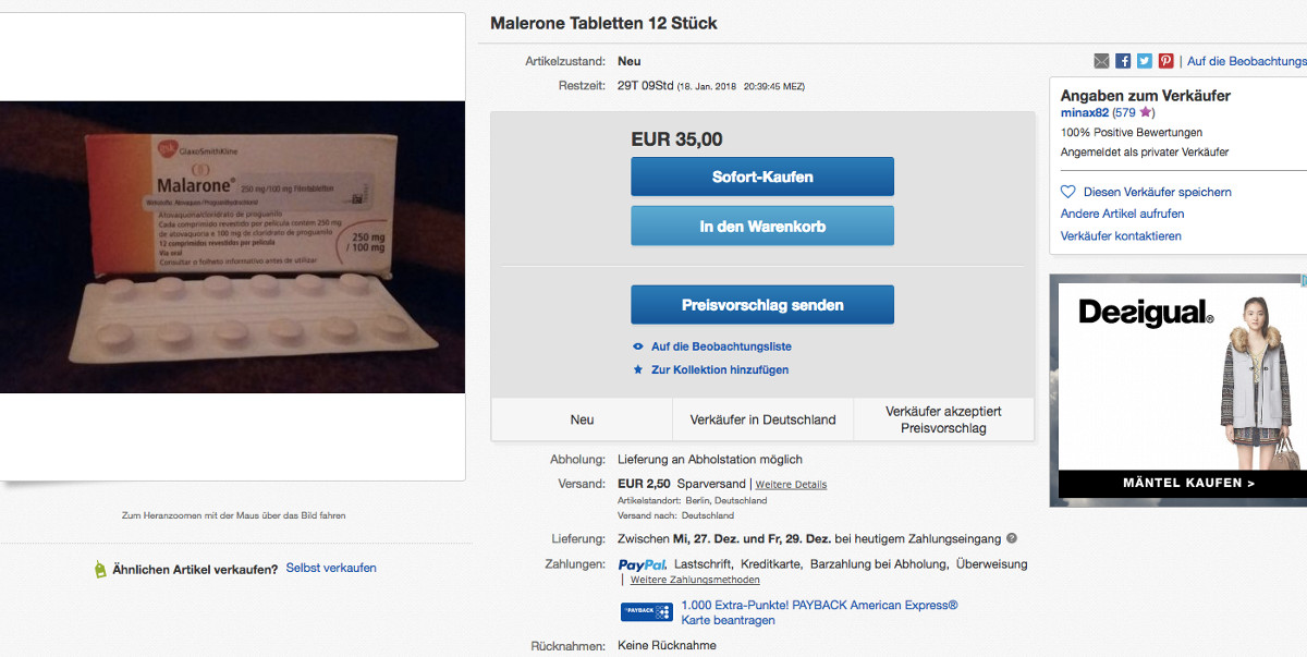 Aus dem Urlaub bringt man nicht nur viele Eindrücke zurück, sondern unter Umständen auch unbenutzte Arzneimittel. Was macht man dann mit den nicht benötigten Präparaten? Eine Frage, die sich Minax82 scheinbar mit einem Ebay-Verkauf beantwortet hat. Zu haben ist Malarone (Atovaquon/Proguanilhydrochlorid, GSK). Der private Nutzer hat das Arzneimittel zum Sofortkauf für 35 Euro zuzüglich 2,50 Euro Porto im Angebot.