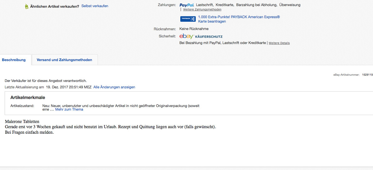Gekauft wurde das verschreibungspflichtige Medikament im Oktober für 120 Euro. Das Verfalldatum ist mit August 2019 angegeben. Das aktuelle Gebot liegt mit drei Preisvorschlägen derzeit bei nur einem Euro. Wird die Offerte nicht vorab gelöscht, kann noch bis zum 27. Dezember mitgeboten werden. Verschickt wird via Standardversand für 4,99 Euro.