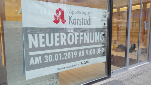 Die Apotheke im Berliner Edelkaufhaus KaDeWe ist gerade umgezogen, die neue Offizin befindet sich am Kurfürstendamm, gleich neben Karstadt. Doch sie ist nur eine Übergangslösung. In ein paar Jahren soll es wieder zurück an den alten Standort gehen. Dann soll dort ein neues, größeres Haus stehen, mit vielen Büros und Tiefgarage. Karstadt soll dann auch abgerissen werden.