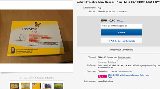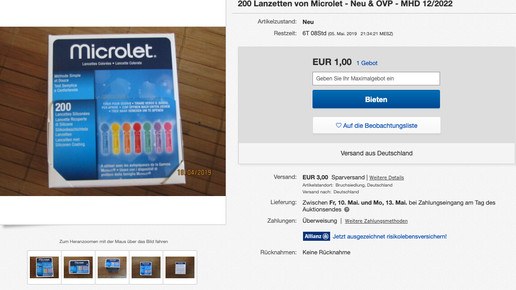 Neben Kinderschuhen und Damenhosen sind auch Microlet-Lanzetten, Freestyle-Libre-Sensoren und ein NovoRapid-Flexpen im Repertoire der Verkäuferin. Mit einem Startpreis von je einem Euro können die Produkte innerhalb von sieben Tagen ersteigert werden. Alles wird laut Deklaration im neuwertigen Zustand angeboten, durch die Ersteigerung mehrerer Produkte sei sogar eine Einsparung bei den Portokosten möglich.