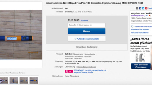 Neben Kinderschuhen und Damenhosen sind auch Microlet-Lanzetten, Freestyle-Libre-Sensoren und ein NovoRapid-Flexpen im Repertoire der Verkäuferin. Mit einem Startpreis von je einem Euro können die Produkte innerhalb von sieben Tagen ersteigert werden. Alles wird laut Deklaration im neuwertigen Zustand angeboten, durch die Ersteigerung mehrerer Produkte sei sogar eine Einsparung bei den Portokosten möglich.
