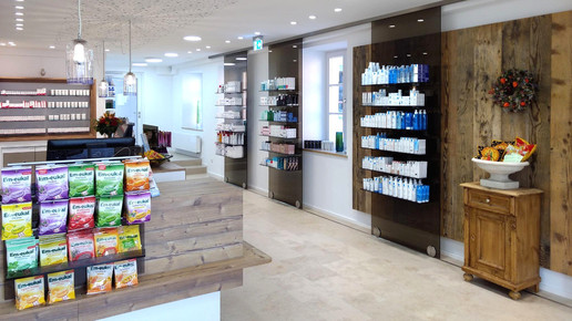 Den hatten die Vollmers vorsorglich schon fest eingeplant. An der Apothekenwand sind Fußbodendielen aus dem Bischofssitz von Regensburg verbaut. Die Dielen steuerte ihr Bauherr und Vermieter Thomas Semmler bei, der auf die Restaurierung von alten Gebäuden spezialisiert ist. Die Offizin vereint Tradition und Moderne. Der Apothekeneinrichter Planquelle aus Straubing verbaute dafür viel natürliches Material, wie Holz, Glas und Stein.