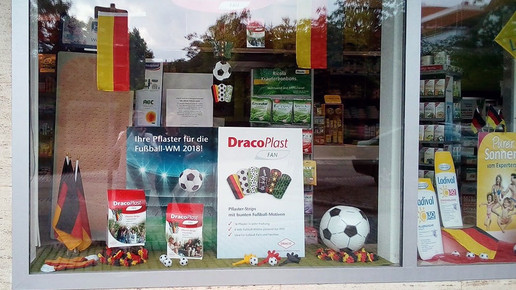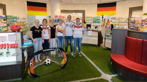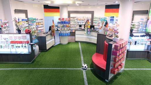 Auch wenn das Fußball-Fieber nach dem schlechten Start der deutschen Mannschaft einen spürbaren Dämpfer erhalten hat, präsentieren sich zahlreiche Apotheken im Schwarz-Rot-Gold-Look. Viele Kollegen dekorieren anlässlich der Fußball-WM in Russland mit allem, was die Deko-Kiste hergibt. Im niedersächsische Dinklage hat Sebastian Müller die Offizin seiner Von-Galen-Apotheke für die Dauer der Weltmeisterschaft in ein Fußballfeld verwandelt. Das kommt an.