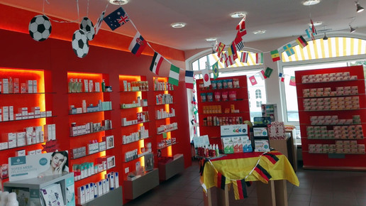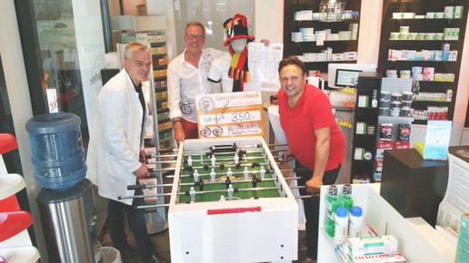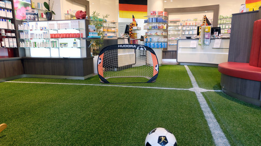 „Wir sind zwar sehr gut hier angekommen und auch aufgenommen worden. Wenn man aber neu in der Stadt ist, muss man versuchen im Gespräch zu bleiben“, gibt Müller zu bedenken. „Das ist uns mit der Dekoration gelungen.“ Viele der Kunden würden beim Betreten der Offizin nicht nur staunen, sondern versuchen, ein Tor zu schießen. Kaum ein Erwachsener und schon gar kein Kind schaffe es, am Fußball mitten in der Offizin einfach vorbeizugehen. Sogar eine hochbetagte Seniorin ließ ihren Rollator für wenige Augenblicke stehen und trat gegen den Ball, berichtet der Apotheker.
