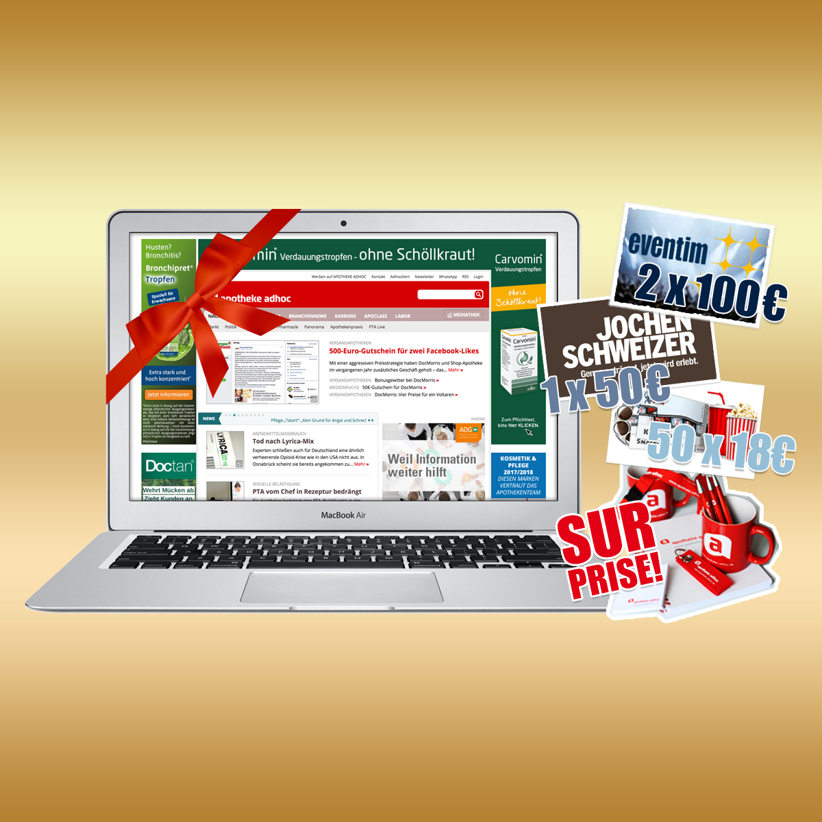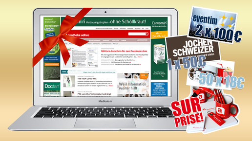 Die Befragung ist absolut anonym. Separat können Teilnehmer an einem Gewinnspiel teilnehmen. Dort warten mehr als 100 Preise im Gesamtwert von rund 2.500 Euro: Hauptpreis ist ein MacBook Air. Außerdem gibt es einen 50-Euro-Gutschein für Jochen Schweizer zu gewinnen, zwei 100-Euro-Gutscheine für eventim.de, 50 Kino-&Snack-Gutscheine von MovieChoice und 50 Office-Offizin-Pakete von APOTHEKE ADHOC. Die Gewinner werden persönlich nach Abschluss der Umfrage benachrichtigt.