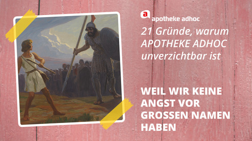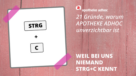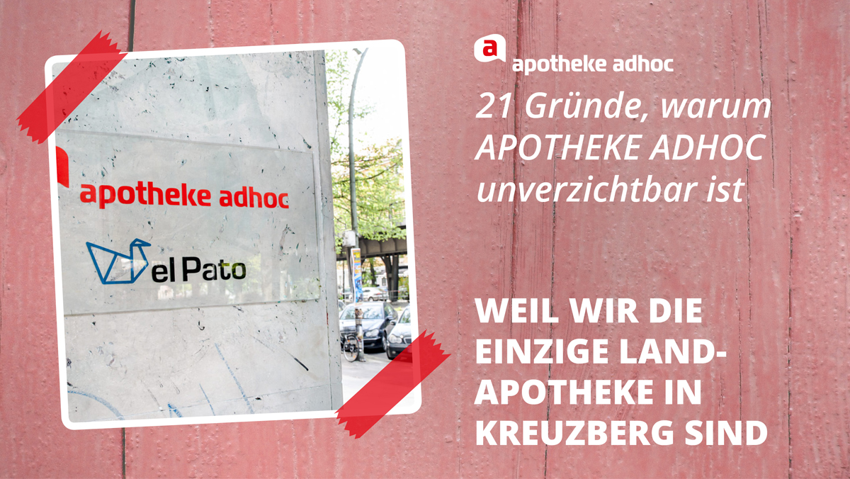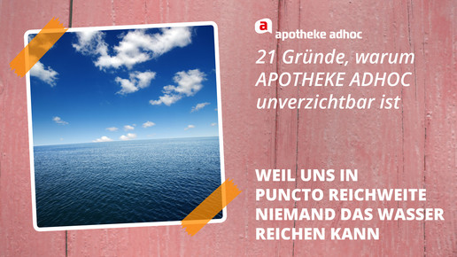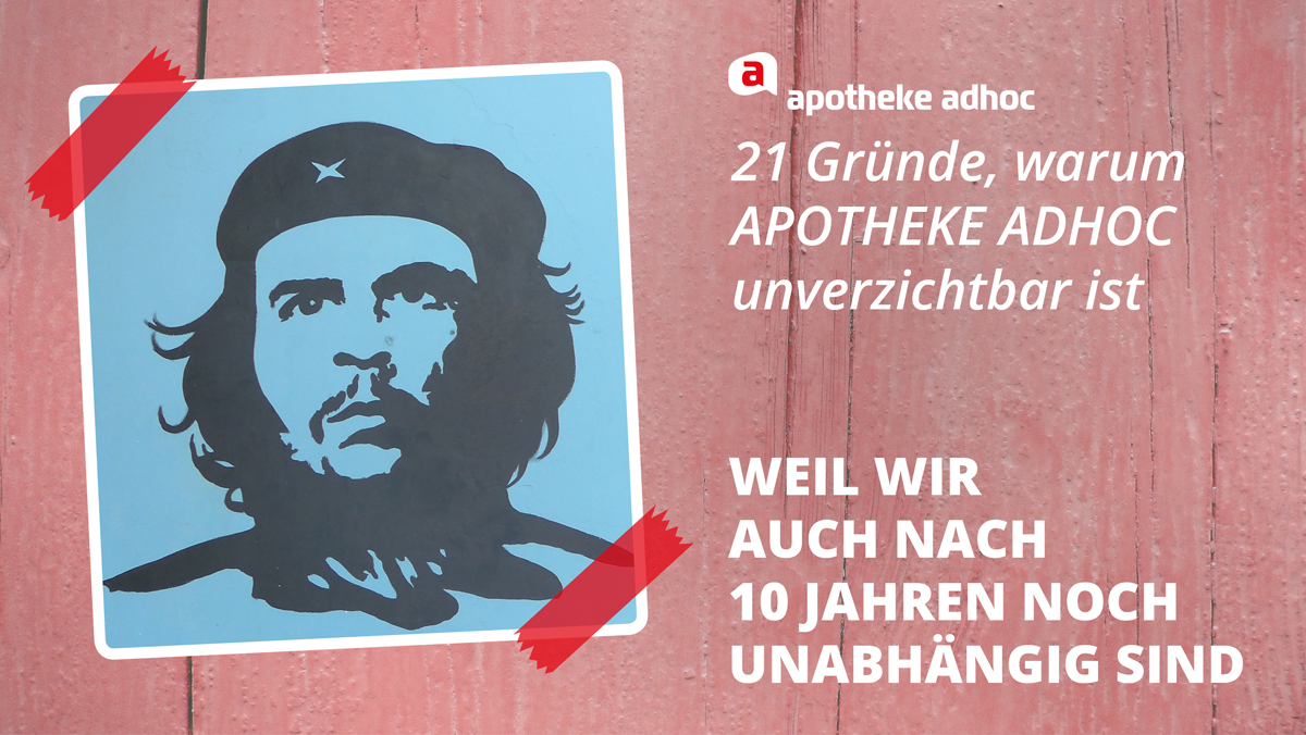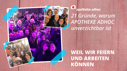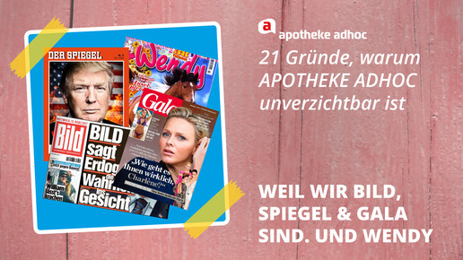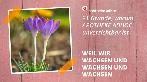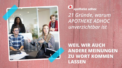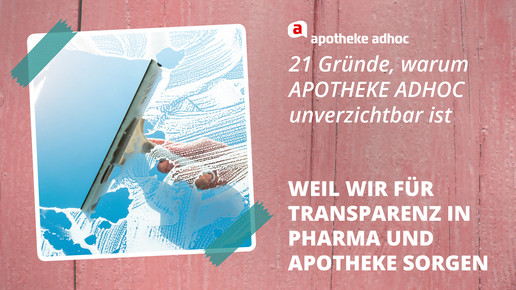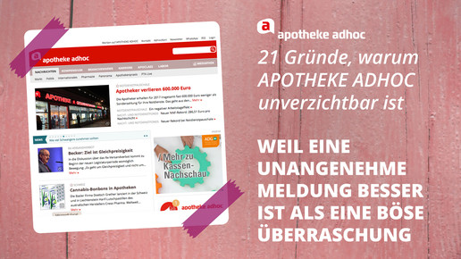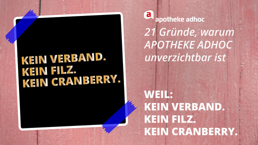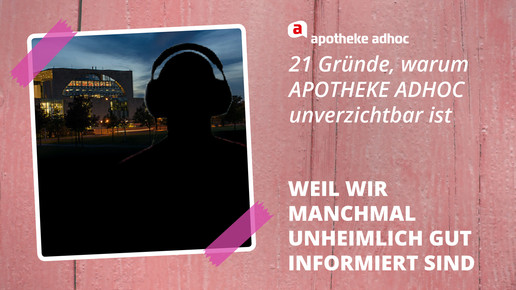 Seit 2007 steht APOTHEKE ADHOC für aktuelle und exklusive Nachrichten und Hintergründe aus dem Apotheken- und Pharmamarkt. Als bedeutendes Branchenportal setzt APOTHEKE ADHOC auf zeitgemäße, unabhängige Information und spannende Hintergründe. Die Leserschaft ist anspruchsvoll und kritisch – deshalb ist die Meinung der Nutzer wichtig! APOTHEKE ADHOC möchte wissen, was die Leser über das Angebot denken und in die Weiterentwicklung des Portals einbinden.