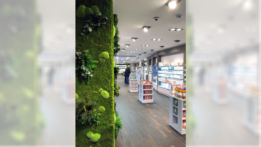 Die Stammkunden aus der alten Engel-Apotheke sind zu 90 Prozent mitgekommen und auch viele neue Kunden stecken den Kopf in die Tür. An den Wänden grünt es, Burggraf hat an den Wänden echtes Moos installieren lassen. „Das ist ein echter Hingucker“, sagt der Apotheker. Zudem erfüllt das Moos jedoch auch weitere Zwecke: „Es macht ein angenehmes Raumklima und die Offizin ruhiger.“ Pflegeleicht ist das Innenraum-Grün auch, bei optimaler Raumfeuchtigkeit muss man es weder wässern noch auf andere Art pflegen und es hält jahrelang.