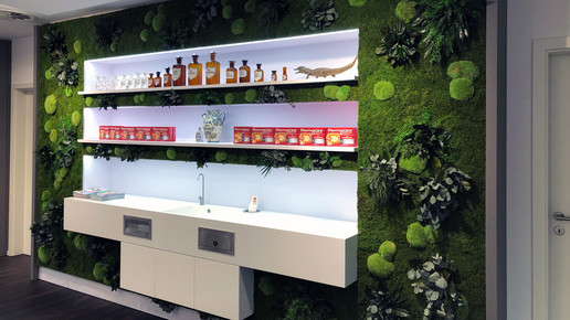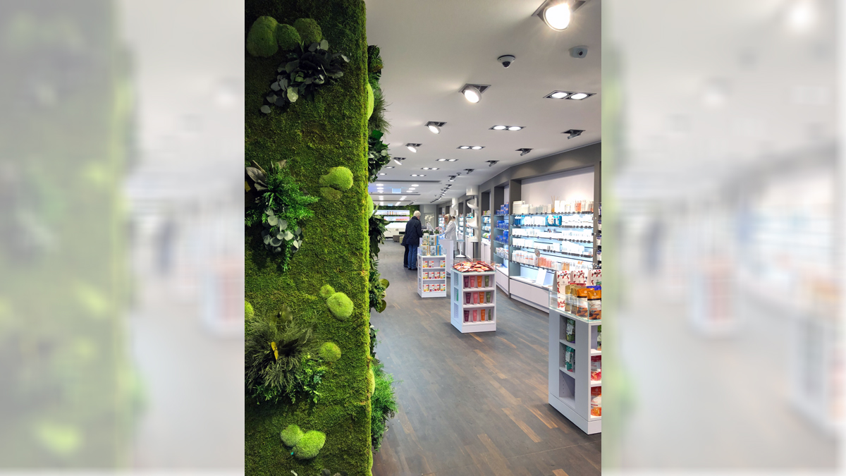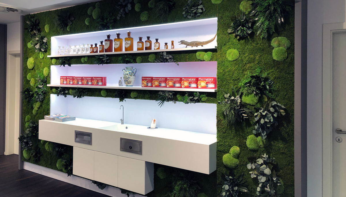 Die Stammkunden aus der alten Engel-Apotheke sind zu 90 Prozent mitgekommen und auch viele neue Kunden stecken den Kopf in die Tür. An den Wänden grünt es, Burggraf hat an den Wänden echtes Moos installieren lassen. „Das ist ein echter Hingucker“, sagt der Apotheker. Zudem erfüllt das Moos jedoch auch weitere Zwecke: „Es macht ein angenehmes Raumklima und die Offizin ruhiger.“ Pflegeleicht ist das Innenraum-Grün auch, bei optimaler Raumfeuchtigkeit muss man es weder wässern noch auf andere Art pflegen und es hält jahrelang.