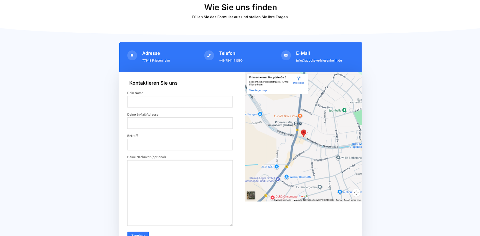 Am Fuße der Website befindet sich ein Kontaktformular mit Google-Maps-Integration. Als Adresse ist die Friesenheimer Hauptstraße 5 – der Standort der geschlossenen Apotheke – im gleichnamigen Ort angegeben.