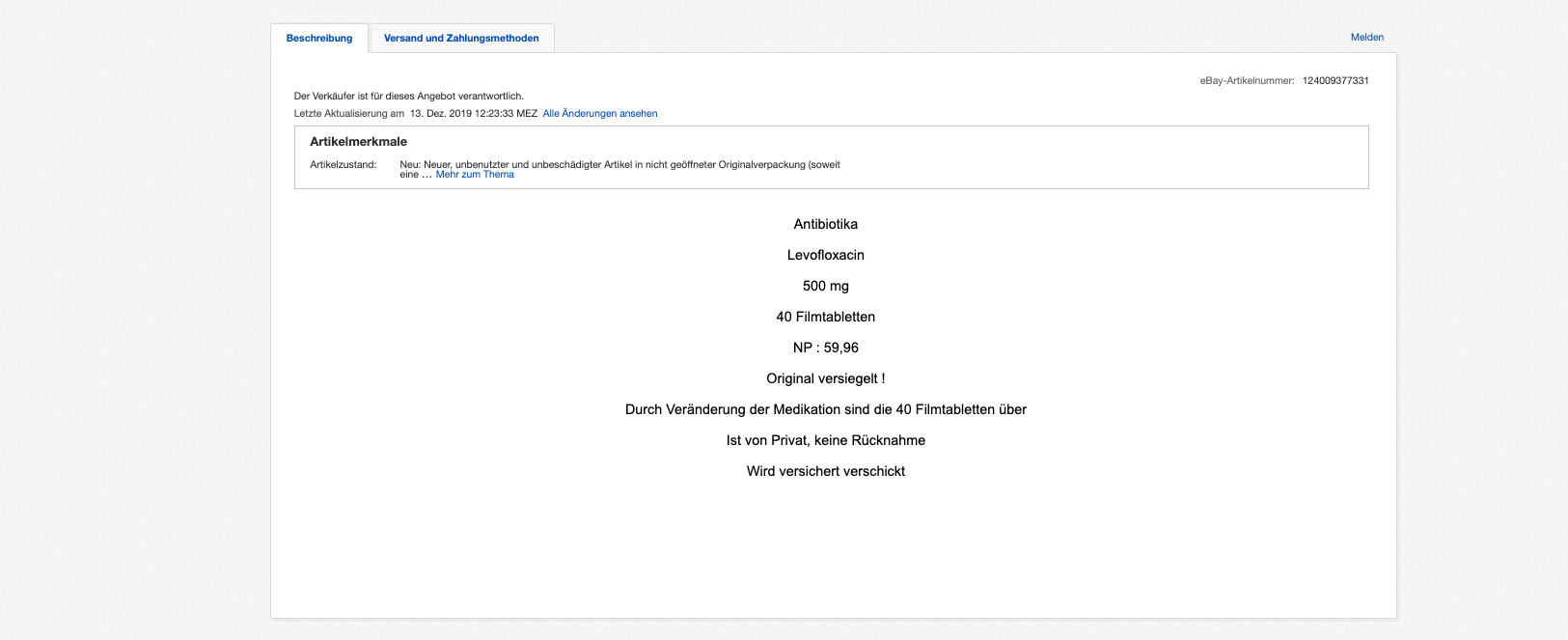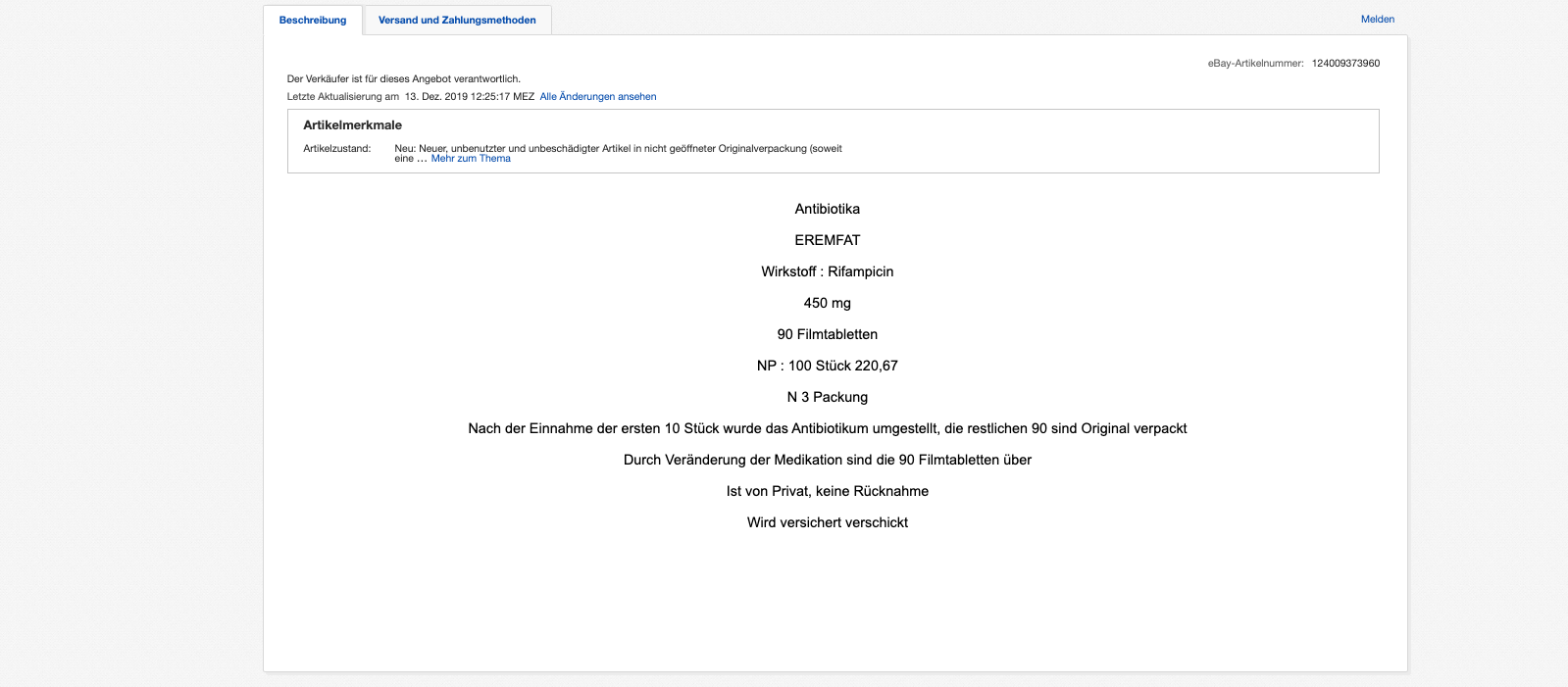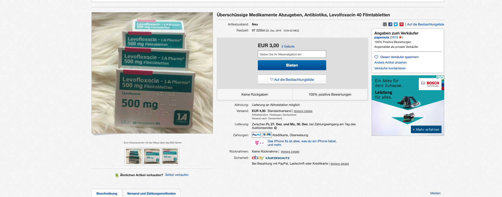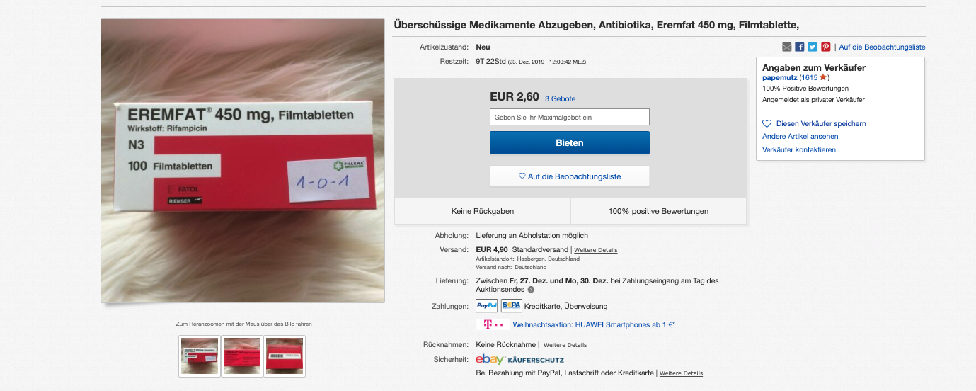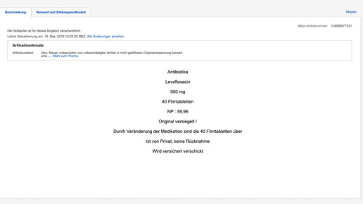 Einmal werden 90 Tabletten des Präparates Eremfat mit dem Wirkstoff Rifampicin angeboten – hier habe er nur zehn Tabletten eingenommen, bevor seine Medikation umgestellt wurde, schreibt der Nutzer. Das zweite Angebot sind vier Packungen Levofloxacin mit jeweils zehn Tabletten. Letztere sind noch „originalversiegelt“. Grund für den Verkauf sei eine Veränderung der Medikation. Beide Angebote wurden mit einem Startpreis von je einem Euro inseriert und sollen insgesamt über zehn Tage laufen. Der Anbieter „papemutz“ bietet seinen potenziellen Käufern einen versicherten Versand an.