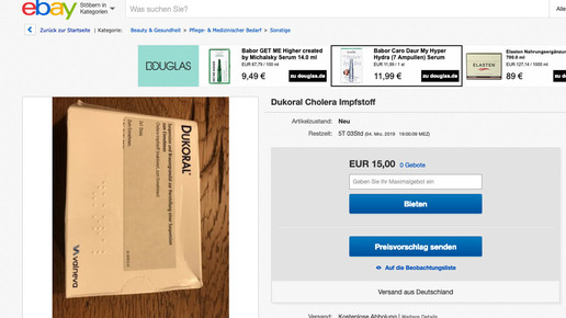 Von der Verschreibungs- und Apothekenpflicht zeigen sich Ebay-Mitglieder immer wieder unbeeindruckt. Auf dem Online-Marktplatz kommt alles unter den Hammer, Arzneimittel sind immer wieder illegal im Angebot. Aktuell kann für Dukoral (Cholera-Impfstoff, GSK) geboten werden.