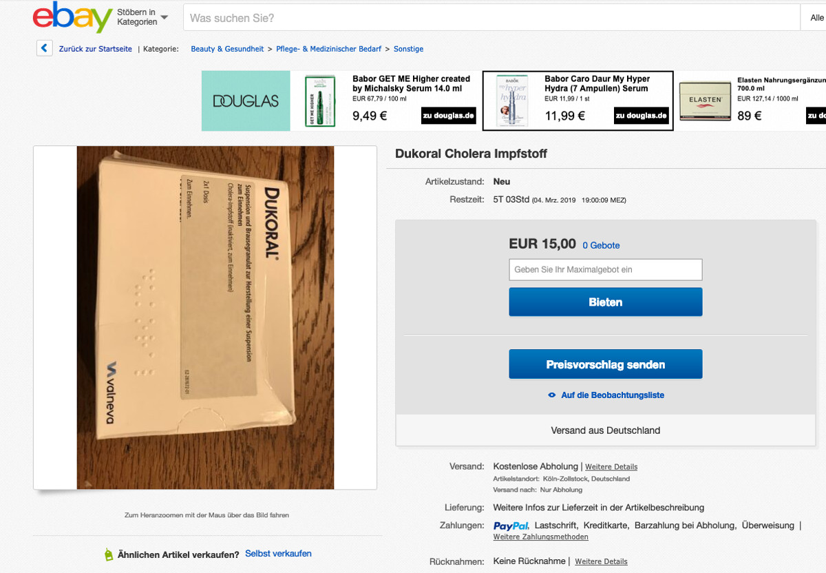 Im Angebot ist eine Packung Dukoral 2 mal eine Dosis. Das Startgebot liegt bei 15 Euro. Gebote gibt es derzeit noch keine. Wird das Angebot nicht vorab gelöscht, kann noch bis zum 4. März mitgeboten werden.