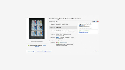 „sausj“ ist seit 2002 auf Ebay als Verkäufer aktiv. Im Angebot ist immer wieder die hochkalorische Trinknahrung Fresubin Energy Drink. Das Mitglied scheint über ein Depot gar in der Dimension des Großhandels zu haben. Zuletzt wurden 48 Flaschen zu je 200 ml im Mischkarton für 57 Euro verkauft – Versandkosten fallen nicht an, das Produkt wird gratis aus Berlin verschickt. Die Bewertungen für sausj sind durchgängig positiv.