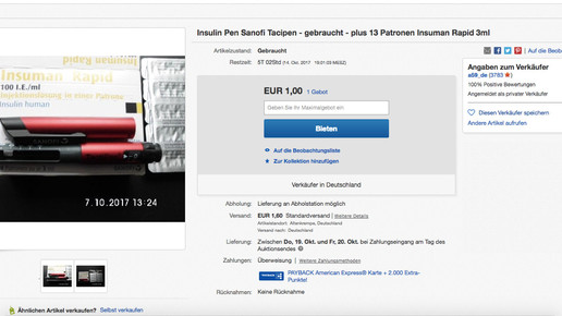 Tactipen und 13 Patronen Insuman Rapid 100 I.E./ml zu je drei Milliliter sowie elf Patronen Insuman Basal 100 I.E./ml zu je drei Milliliter sind auf Ebay zu finden. a59_de gibt an: „Wegen einer Insulinumstellung kann ich das Insulin nicht weiter verwenden.“ Weiter heißt es: „Ich denke es ist zu wertvoll als es zu vernichten.“ Die Gebote liegen aktuell jeweils bei einem Euro. Werden die Angebote nicht vorzeitig gelöscht, kann noch fünf Tage mitgeboten werden.