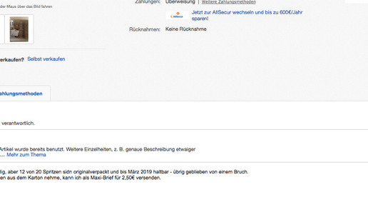 Versendet wird für 3,89 Euro per Standardversand – möglich ist auch ein Maxibrief für 2,50 Euro, wenn k-trin die Spritzen für den Versand aus dem Karton nimmt. Das Angebot liegt derzeit bei einem Euro und einem Bieter. Wird die Offerte nicht vorher entfernt, kann noch bis zum 12. November mitgeboten werden.