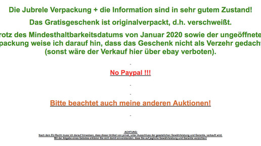 Nach dem Motto verkaufen nein – verschenken ja, kann noch bis zum 12. November für die Verpackung mitgeboten werden, vorausgesetzt das Angebot wird nicht vorab gelöscht. Bislang gibt es ein Gebot. Das Angebot liegt derzeit bei einem Euro. Claudilebt sichert sich weiter ab: „Achtung: Nach dem EU-Recht muss ich darauf hinweisen, dass dieser Artikel von privat, unter Ausschluss der gesetzlichen Gewährleistung und Garantie, verkauft wird. Mit der Abgabe eines Gebotes erklären Sie sich damit einverstanden, dass Sie auf jegliche Gewährleistung und Garantie verzichten.“