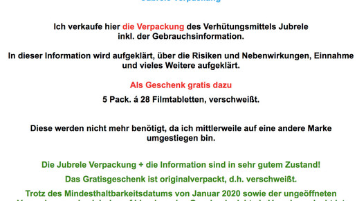 Im Angebot ist die Umverpackung des oralen Kontrazeptivums Jubrele (Desogestrel, MSD). Claudilebt benötigt die Pille nicht mehr, da „mittlerweile auf eine andere Marke umgestiegen“ wurde. Das Ebay-Mitglied weist explizit darauf hin, nur die Verpackung inklusive Gebrauchsinformation zu verkaufen. „In dieser Information wird aufgeklärt, über die Risiken und Nebenwirkungen, Einnahme und vieles Weitere aufgeklärt.“