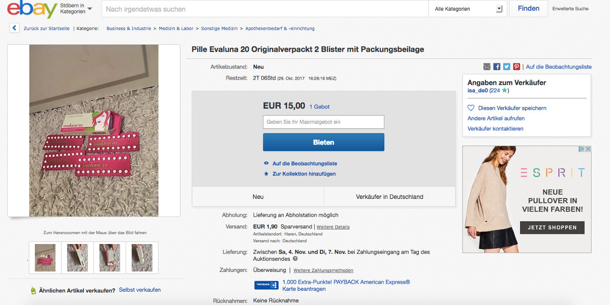 Erst in der vergangenen Woche waren Ebay-Nutzer durch verschreibungspflichtige Angebote aufgefallen. Isa_de0 aus Haren zeigte sich „für alles offen“. „Verkaufe auch getragene Wäsche zu einem Aufpreis ;)“, schrieb die junge Frau in ihrem Profil. Zuletzt hatte isa_de0 jedoch vier Blister Evaluna 20 im Angebot. Aufgrund eines Pillenwechsels wurde das Kontrazeptivum nicht mehr benötigt. Rollinshenry hatte Omeprazol im Angebot. Ein Blick in die Bewertungen verriet außerdem hohe Abverkaufszahlen an Fresubin und Blutzuckerteststreifen.