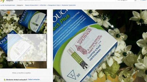 nikitschuldei-0 aus Wuppertal hat jedenfalls Mitleid mit Diabetikern, die selbst Teststreifen kaufen müssen. Zwischen Weintrauben und Blumen hat der private Nutzer zwei Packungen One Touch Select Plus in Szene gesetzt. Auf der Ware klebt das Etikett von der „Märkischen Apotheke“ in Schwelm. Die Ware ist als Sofortkauf für 29,50 Euro zu haben, Versandkosten werden nicht fällig. Wird das Angebot nicht vorzeitig gelöscht, kann noch bis zum 27. November mitgeboten werden.