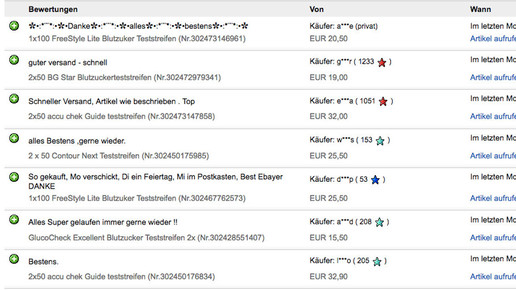 Freestyle, BG Star, Accu Chek oder Contour – renat1976 hat sie alle. Im vergangenen Monat hat das Ebay-Mitglied – berechnet an den positiven Bewertungen – 700 Teststreifen verkauft. Negativ aus Sicht der Apotheken und Krankenkassen. Verkauft wurden immer 100 Stück beziehungsweise zwei Packungen zu je 50 Teststreifen, je nach Produkt. Die Kunden zahlten zwischen 15,50 Euro für GlucoCheck Excellent und 32,90 Euro für Accu Chek Guide.