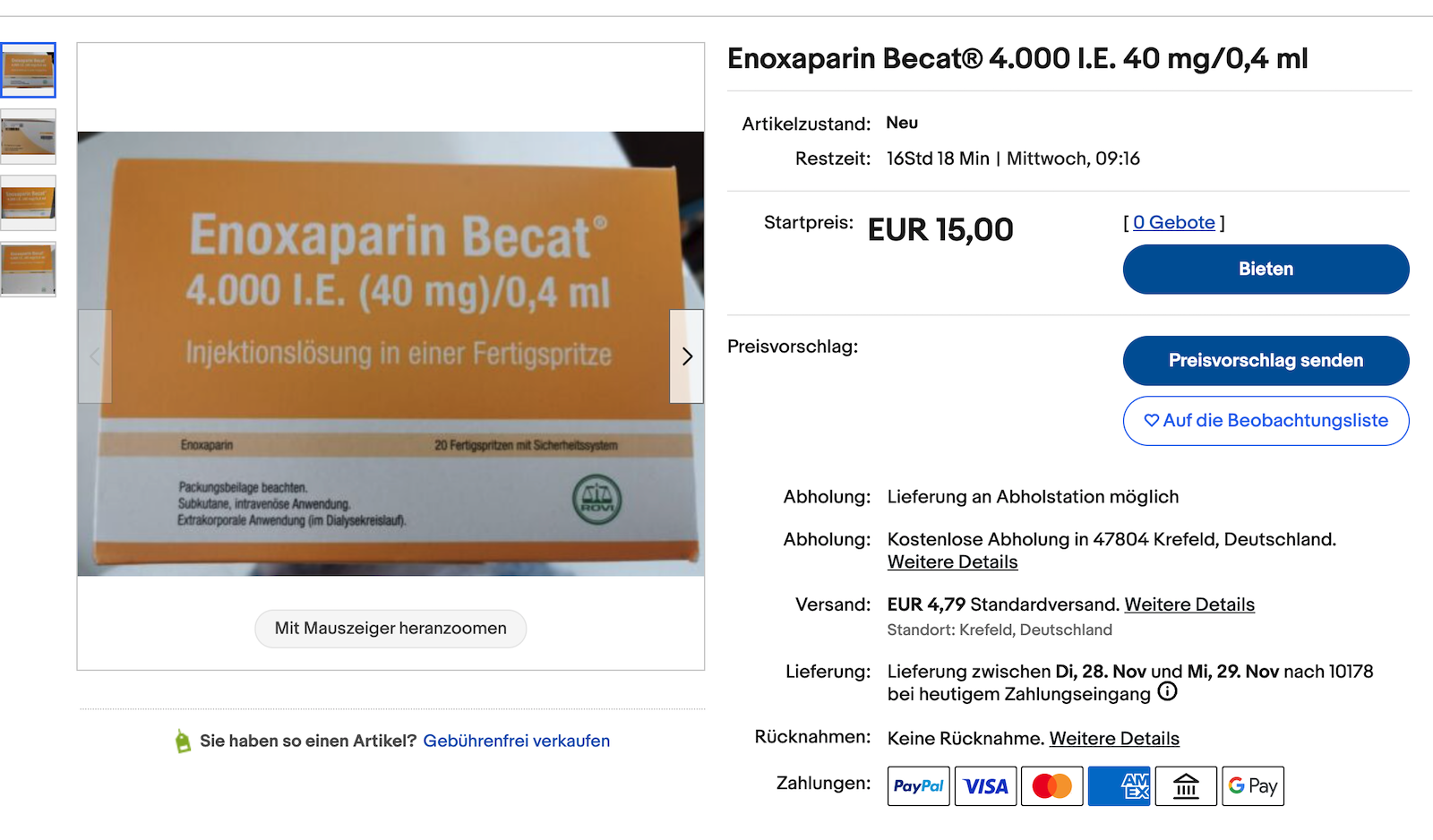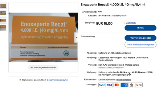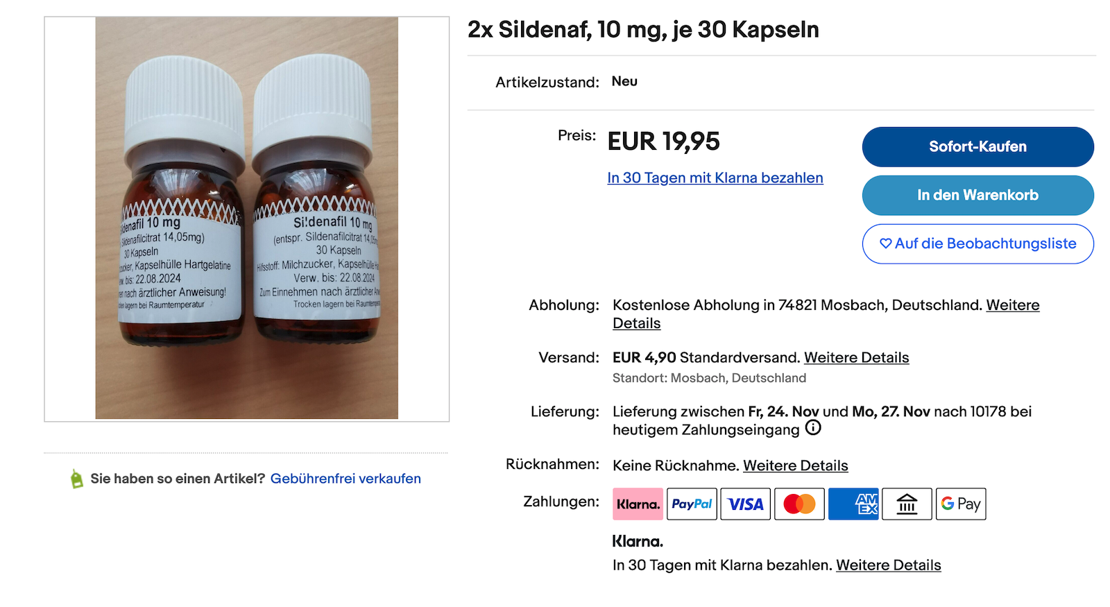 Anders als bei früheren Angeboten scheint es sich bei den aktuellen Fällen um unbedarfte Verkäufer:innen zu handeln. Der User „eintagsfliege13“ bieten zwar eine Packung Enoxaparin an. Hauptsächlich scheint sich der Verkaufende aber auf Edelstein-Ketten festgelegt zu haben. Ähnlich sieht es bei „zoernle“ aus: Der User bietet hauptsächlich Kleidung an. Neben einem Brettspiel „Der Preis ist heiß“, Schneeketten und einem alten Magazinkoffer der Bundeswehr krönen dann aber doch zwei 30er-Fläschchen Sildenafil seine Auswahl. In der Artikelbeschreibung betont der Verkäufer allerdings: „Wird nicht mehr benötigt, deshalb zum Verkaufen.“ Außerdem sei dies ein Privatverkauf, „daher keine Garantie und Rücknahme.“