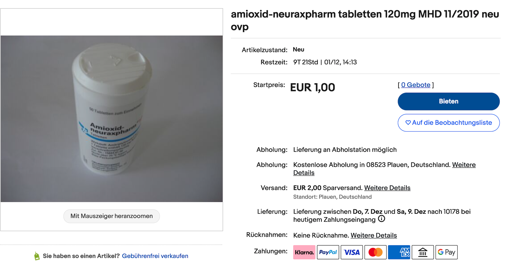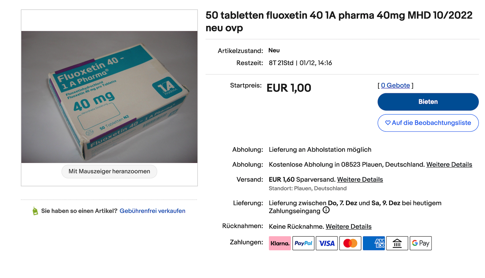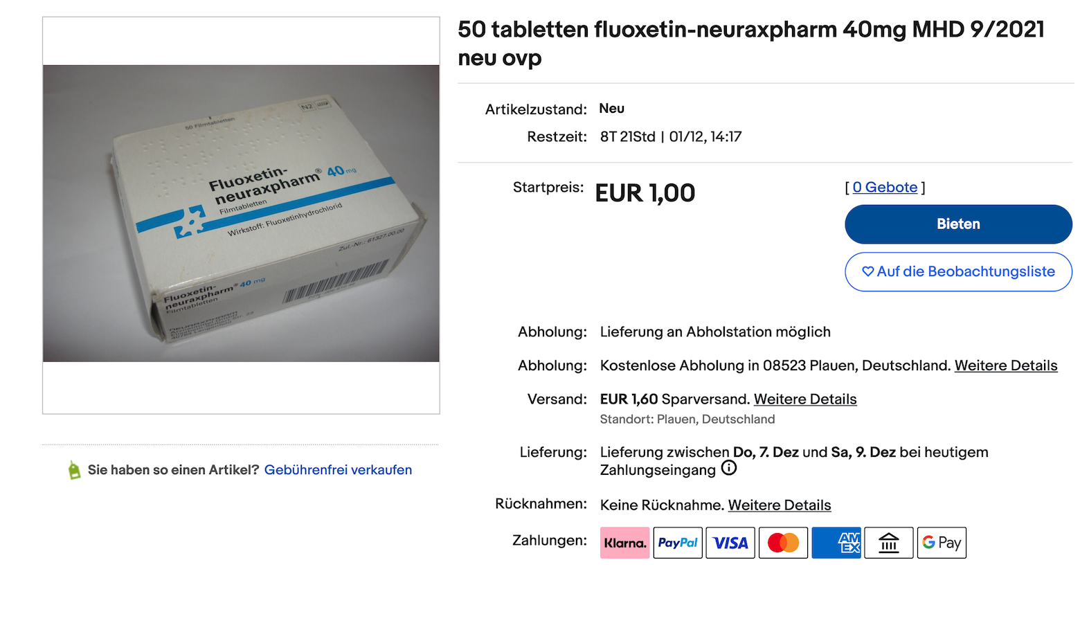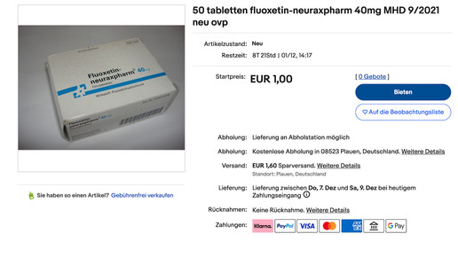 Der User „wols-rica“ verkauft unter dem Motto „Sammelauflösung“ diverse Antidepressiva. Von A wie Amioxid bis Z wie Zolpidem ist einiges dabei. Alle Präparate sind in den Jahren 2021/2022 abgelaufen. Der eigentliche Clou: Nicht nur die verschreibungspflichtigen Medikamente, die er anbietet, haben bei ihm einen Startpreis von einem Euro. Auch eine Silikon-Backform im Totenkopf-Design, limitiertes Badesalz und eine original signierte Autogrammkarte der Wildecker Herzbuben kann man bei ihm für nur einen Euro erstehen. Für eine Unterhose von Nike will „wols-rica“ allerdings 4,90 Euro sehen.