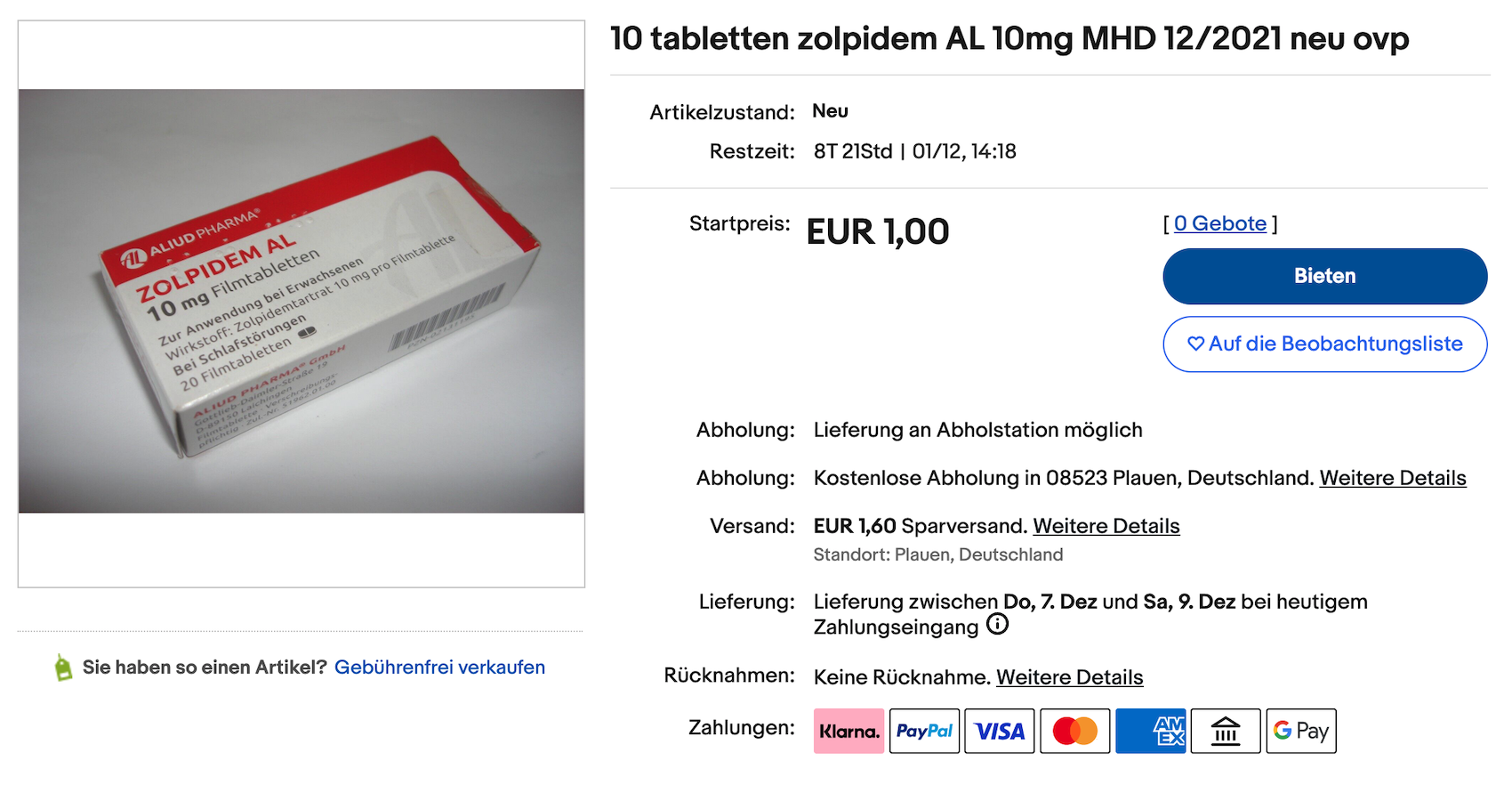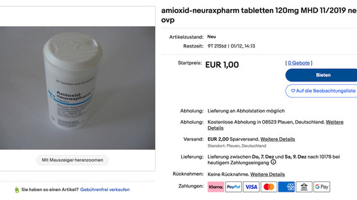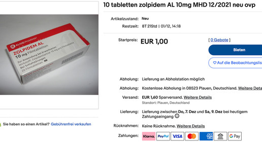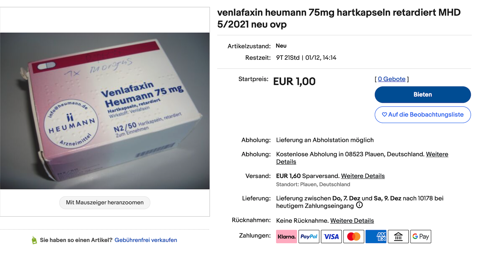 Der User „wols-rica“ verkauft unter dem Motto „Sammelauflösung“ diverse Antidepressiva. Von A wie Amioxid bis Z wie Zolpidem ist einiges dabei. Alle Präparate sind in den Jahren 2021/2022 abgelaufen. Der eigentliche Clou: Nicht nur die verschreibungspflichtigen Medikamente, die er anbietet, haben bei ihm einen Startpreis von einem Euro. Auch eine Silikon-Backform im Totenkopf-Design, limitiertes Badesalz und eine original signierte Autogrammkarte der Wildecker Herzbuben kann man bei ihm für nur einen Euro erstehen. Für eine Unterhose von Nike will „wols-rica“ allerdings 4,90 Euro sehen.