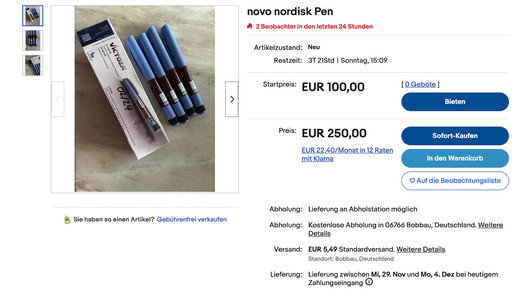 „Fruchtzwerg804“ hat gleich mehrere Victoza-Bundles im Angebot: Acht oder zwei Pens können im Set erstanden werden. Mit diesem größeren Kontingent eines Präparats tanzt dieser User etwas aus der Reihe. Sein 8er-Bundle kennzeichnet „Fruchtzwerg804“ als „Anti-Ageing-Produkt“. Bei einem Startgebot von 100 Euro geht es los – mit einem Sofort-Kauf für 250 Euro sichert man sich den Bestand direkt. Wem das zu teuer ist: Eine Ratenzahlung über 12 Monate via Klarna ist auch möglich.