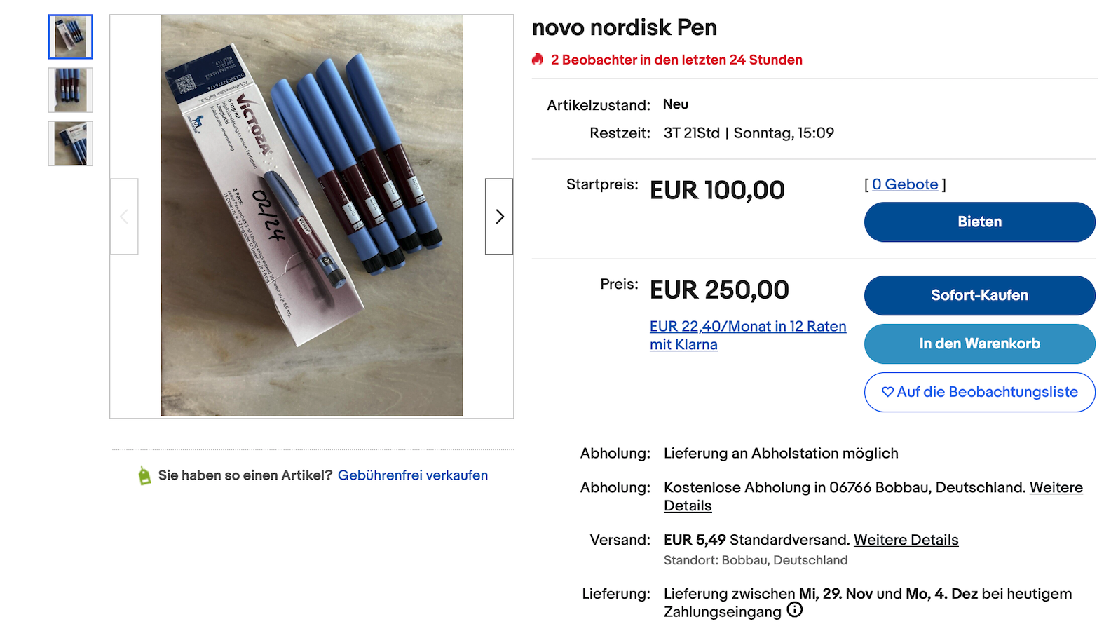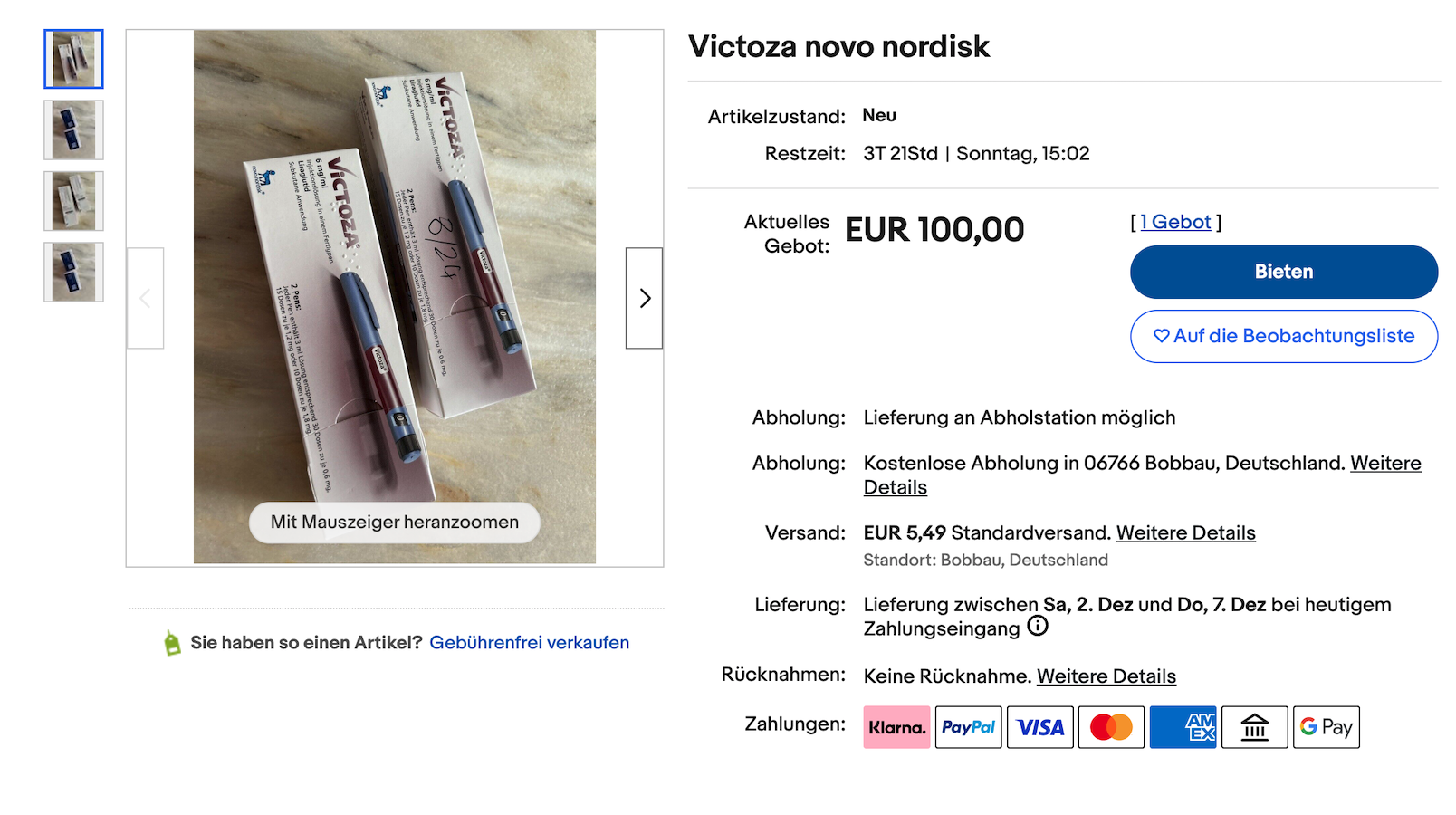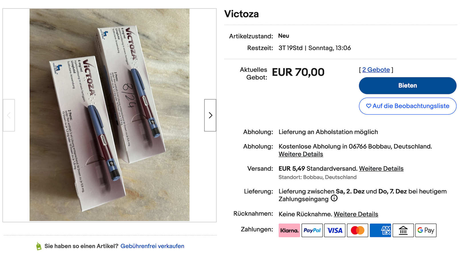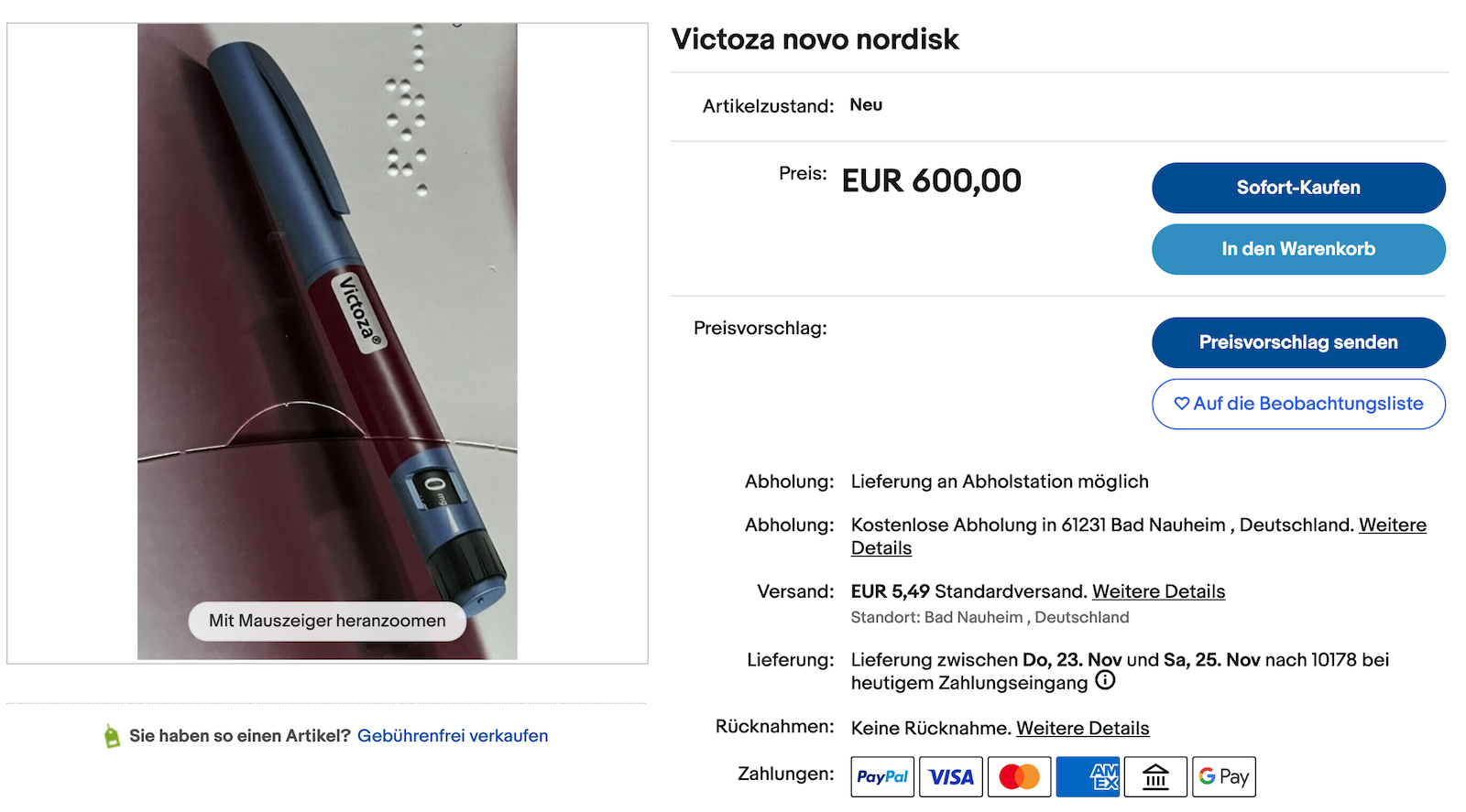 Das Anti-Diabetikum Victoza – Wirkstoff Liraglutid – ist durch die weltweit gestiegene Nachfrage in Apotheken vielfach nicht erhältlich. Auf Ebay sieht das etwas anders aus: Passenderweise bietet „troedler65“ den Pen für 600 Euro an, außerdem gibt es ein paar Engelsflügel für 50 Euro. Allerdings ist er bei weitem nicht der einzige – was Victoza angeht.