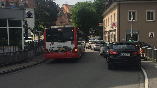 Mögliche Lösungsansätze für das Verkehrschaos wurden Ende Mai in einer öffentlichen Sitzung des Gemeinderates diskutiert. Dominik Könighaus vom Verkehrsplanungsbüro R+T stellte seine Analyse der Situation und denkbare Sofortmaßnahmen vor. Maßgeblich entstehe die problematische Situation durch den an- und abfahrenden Busverkehr, der nur sehr schwer die enge Kurve passieren könne. Die Straße sei an dieser Stelle nicht einmal sechs Meter breit, erklärt der Ingenieur.