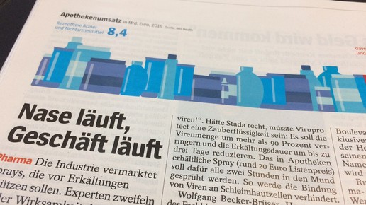 Ausschlaggebend für diese Meinung sind die Medizinprodukte Algovir (Hermes) und Viruprotect (Stada), die als erste Abwehr die Virenlast reduzieren und somit eine Erkältung abwehren sollen. Die Autoren stellen die Frage: „Sind die neuen Sprays also die Lösung für die Januar-Erkältung? Oder nur eine gewiefte Art, auf einem Milliardenmarkt Anteile abzugreifen?“