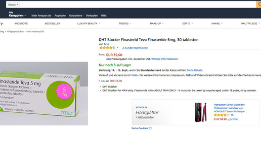 Die Produktbeschreibung fällt spärlich aus: „DHT-Blocker nur für Männer. Finasterid ist nur für erwachsene Männer und darf nicht von Frauen oder Männern jünger als 18 Jahre eingenommen werden.“ Am Freitag waren noch drei Packungen zu je 39 Euro verfügbar, gestern eine Packung zu 44 Euro. Für den Versand werden fünf Euro fällig. Wie lange das Angebot noch gilt, ist ungewiss, aktuell sind noch drei Packungen auf Lager.