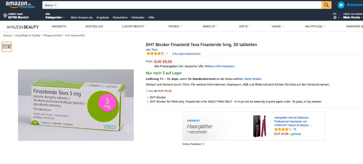 Die Produktbeschreibung fällt spärlich aus: „DHT-Blocker nur für Männer. Finasterid ist nur für erwachsene Männer und darf nicht von Frauen oder Männern jünger als 18 Jahre eingenommen werden.“ Am Freitag waren noch drei Packungen zu je 39 Euro verfügbar, gestern eine Packung zu 44 Euro. Für den Versand werden fünf Euro fällig. Wie lange das Angebot noch gilt, ist ungewiss, aktuell sind noch drei Packungen auf Lager.