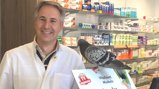 Der Tauben-Kümmerer: Ungewöhnlichen Besuch bekam letztens Dr. Marcel Töpfer in der Marien-Apotheke im münsterländischen Ascheberg. Eine Taube flog zur Tür herein und erschreckte eine Kundin. Völlig grundlos, denn friedlich ließ sich das Tier auf dem Werbeaufsteller für Magnesium nieder.