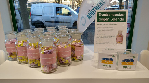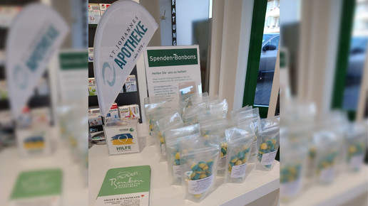Sonja und Christian Engler haben sich in ihrer St. Johannes Apotheke in Troisdorf etwas Besonderes überlegt, um die Spendenbereitschaft der Kund:innen zu erhöhen: Von einer Bonbon-Manufaktur ließen sie Bonbons in den Landesfarben der Ukraine herstellen, welche gegen eine Spende in der Apotheke abgegeben werden. Der Erlös geht an Apotheker ohne Grenzen (AoG).