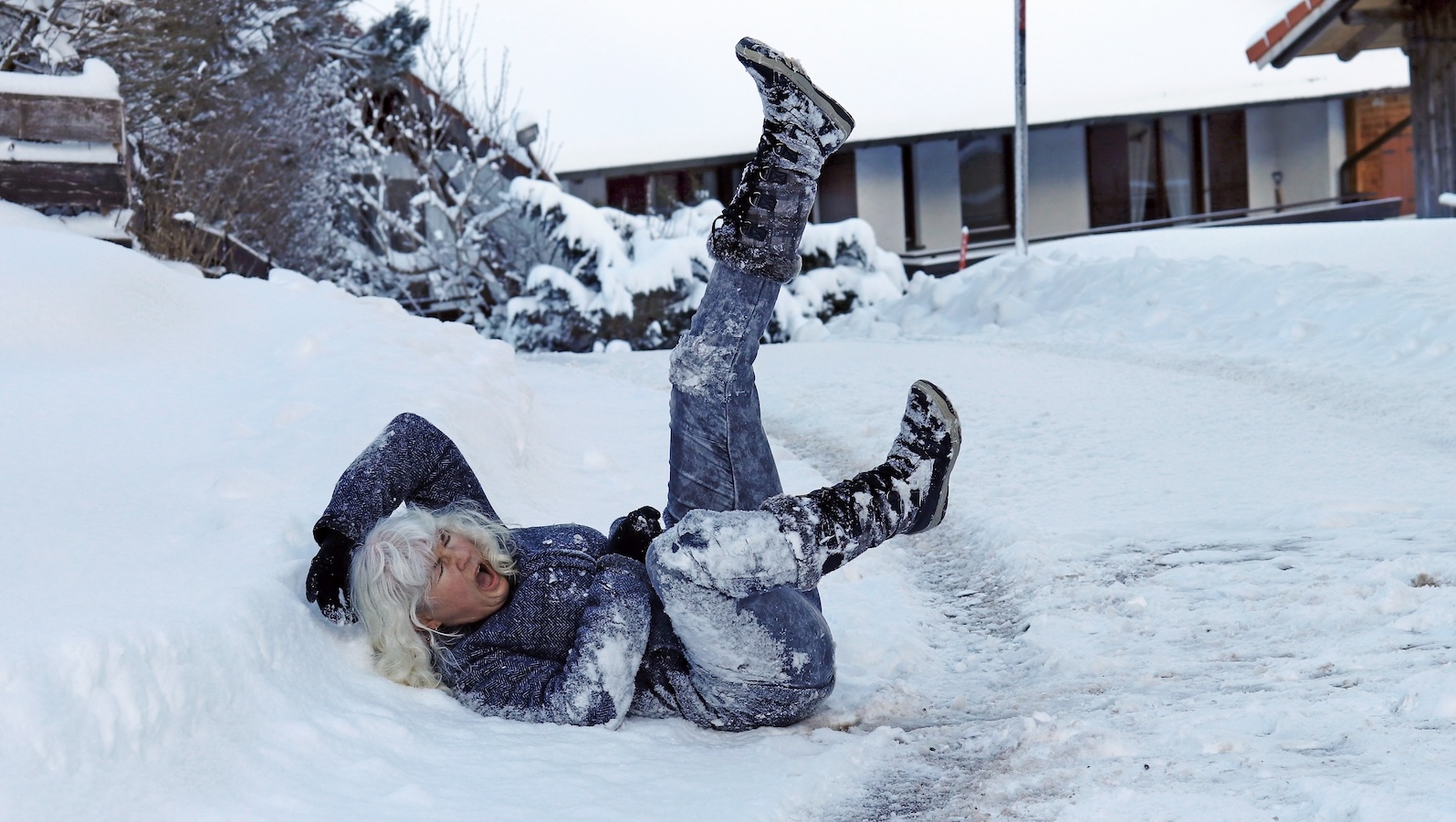 Wenn ältere Menschen auf den Kopf oder die Hüfte fallen, riskieren sie mitunter schwere Verletzungen. Deshalb rät die Deutsche Gesellschaft für Orthopädie und Unfallchirurgie (DGOU) zum Pinguin-Gang bei Glatteis.