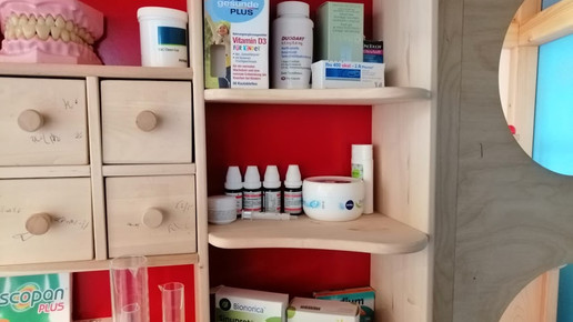 In der Pinguin-Gruppe wurde eine Offizin eingerichtet. Das „Erdgeschoss“ der Burg verwandelten die Erzieher in einen Verkaufsraum – stilecht mit HV-Tisch, Schütten und Regalen. Kreative Ideen holten sie sich dabei von zwei Müttern, die in der Umgebung in der Apotheke tätig sind. Eine davon ist PKA Margareta Bitter aus der Stern-Apotheke in Regenstauf. „Wir haben einige Leerpackungen, Poster und Rezepte in Mini-Format gesponsert.“