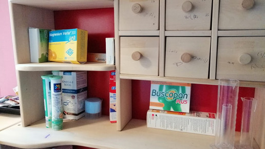 Die Apothekerin unterstützt den Kindergarten gern. „Dadurch kann die Vor-Ort-Apotheke auch in Zukunft mit Fachkräften glänzen“, sagt sie. In der Pinguin-Apotheke können die Kinder mit leeren Globuli-Fläschchen, Buscopan-, Sinupret- und Imodium-Packungen spielen. Außerdem gibt es eine Kasse mit Scanner, Schütten mit Vitaminen und ein Mikroskop. Neben dem HV-Tisch hängt eine Werbung für Läusemittel.