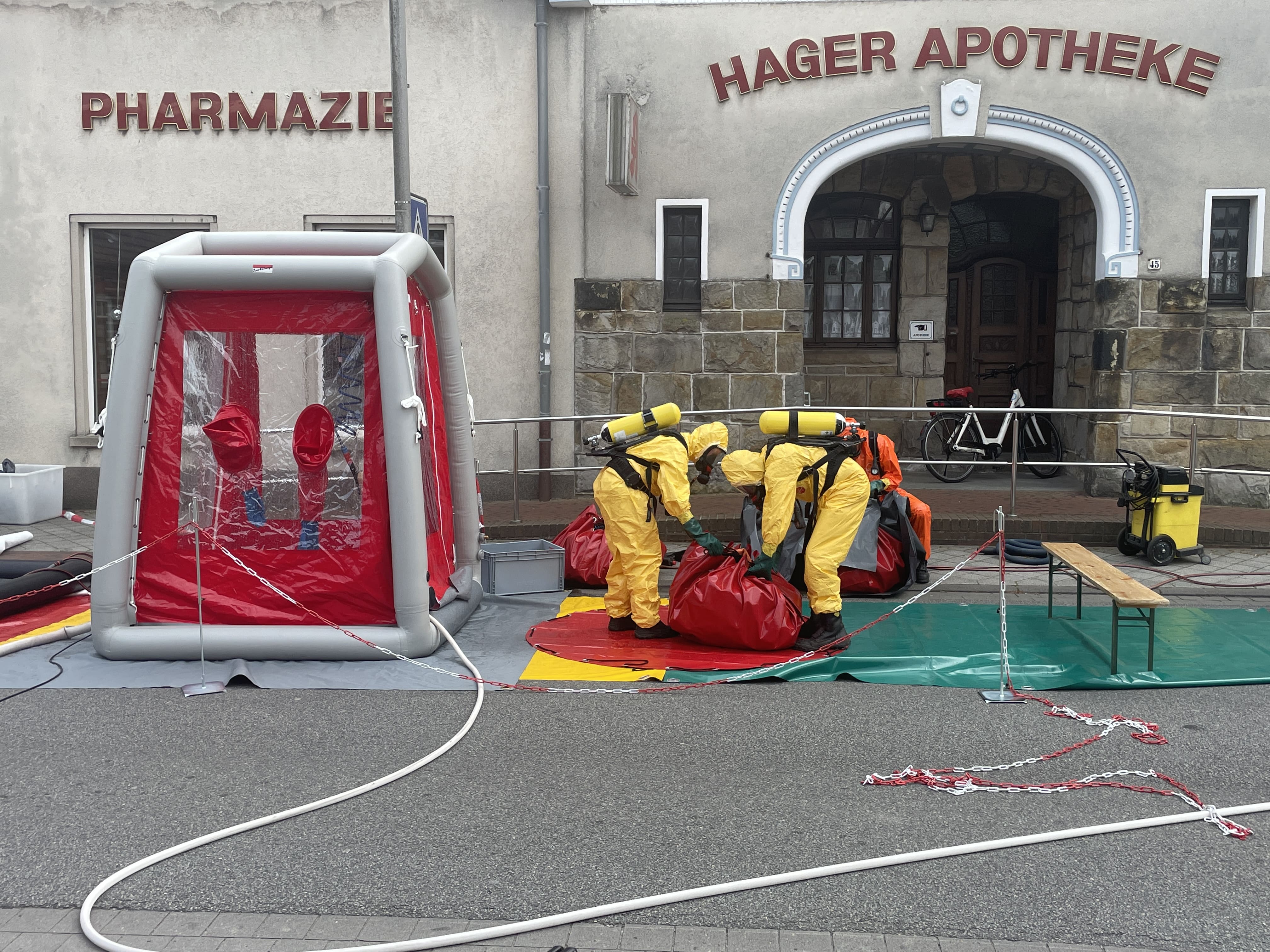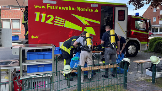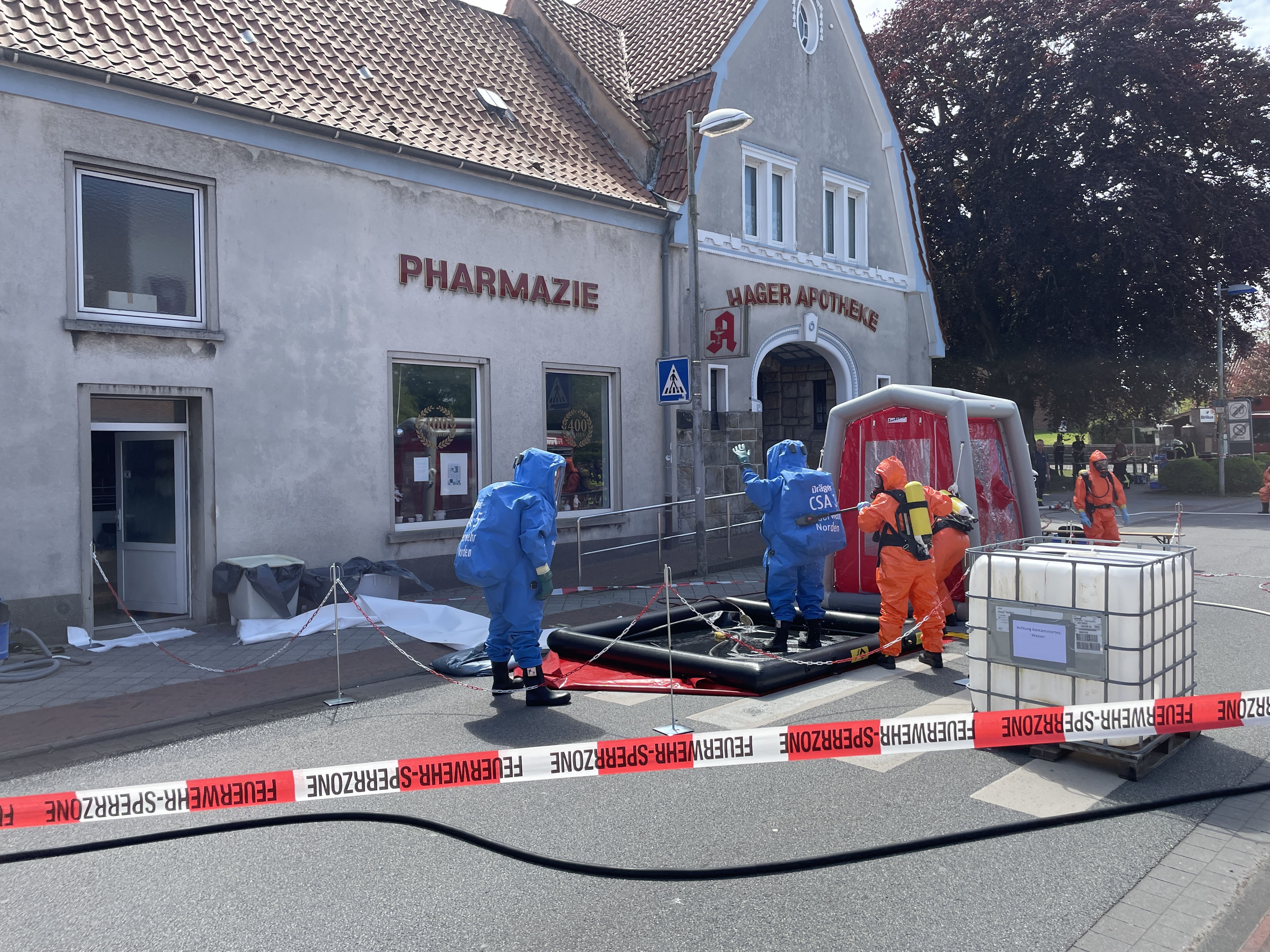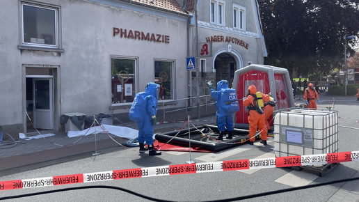 Die Einsatzkräfte der Feuerwehr gingen mit Chemikalienschutzanzügen in das Gebäude. Dann wurde der Gefahrgutzug des Landkreises Aurich geholt. Auch die gesamte Ortsfeuerwehr Hage wurde für Absperrmaßnahmen und Reinigungsarbeiten alarmiert. Die Lage sei ungewöhnlich gewesen, so die Feuerwehr.