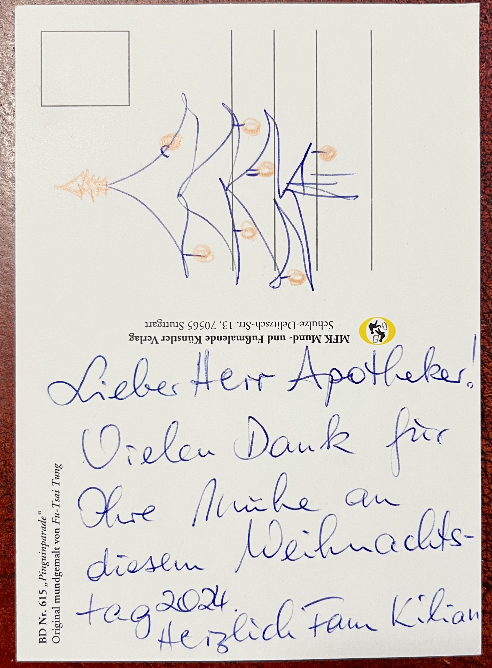 Den Heiligabend hat der Apotheker ohne seine Familie verbracht. „Dass meine Familie mit mir den Notdienst in der Apotheke verbringt, ist ausgeschlossen. Ich will mich auf den Dienst konzentrieren.“ Und dafür waren die Patient:innen sehr dankbar. Eine Kundin hat dem Apotheker eine Karte überreicht mit den Worten: „Lieber Herr Apotheker! Vielen Dank für Ihre Mühe an diesem Weihnachtstag 2024.“ Der Dank der Kund:innen ist den Apotheken sicher, aber die Anerkennung von der Politik fehlt, ärgert sich Erkenbrecher.