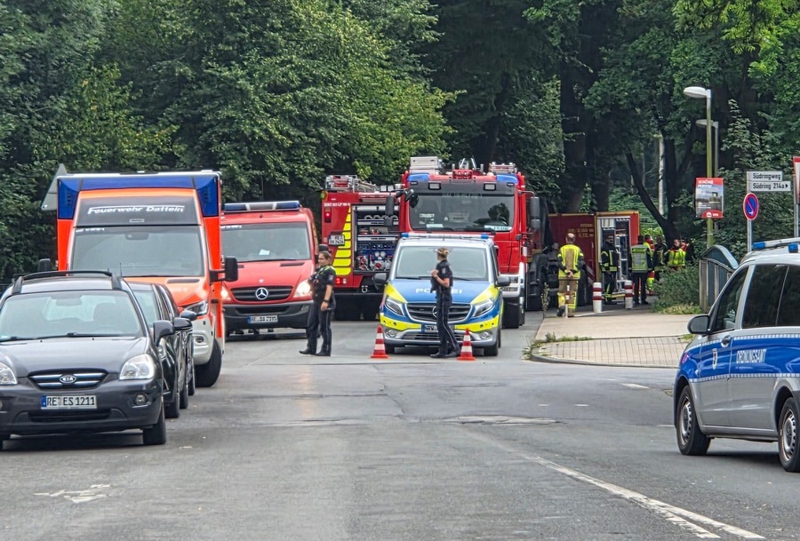 Ein herrenloser Transportbehälter mit einem Gefahrstoffaufkleber hat in Datteln zu einem Großeinsatz geführt. Die Feuerwehr rückte aus und baute einen Dekontaminationsplatz – Hintergrund war die angenommene Gefährdung durch biologische Gefahrstoffe der Kategorie 3. Auch eine Apotheke und ein Ärztehaus wurden evakuiert.