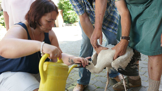 Am Dienstagmorgen kam Zimmermann zur Apotheke. Mithilfe einer Menschenkette wurde der Vogel eingekreist und von Zimmermann mit der Hilfe von Mieth schließlich gefangen. Der Storchenvater fütterte ihn dann erst einmal mit Rindfleischhappen.